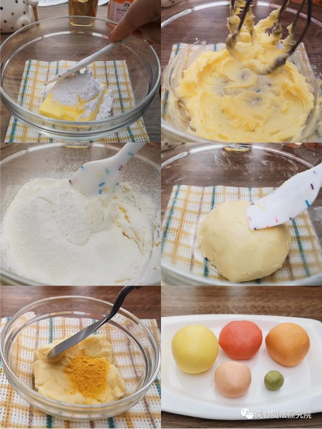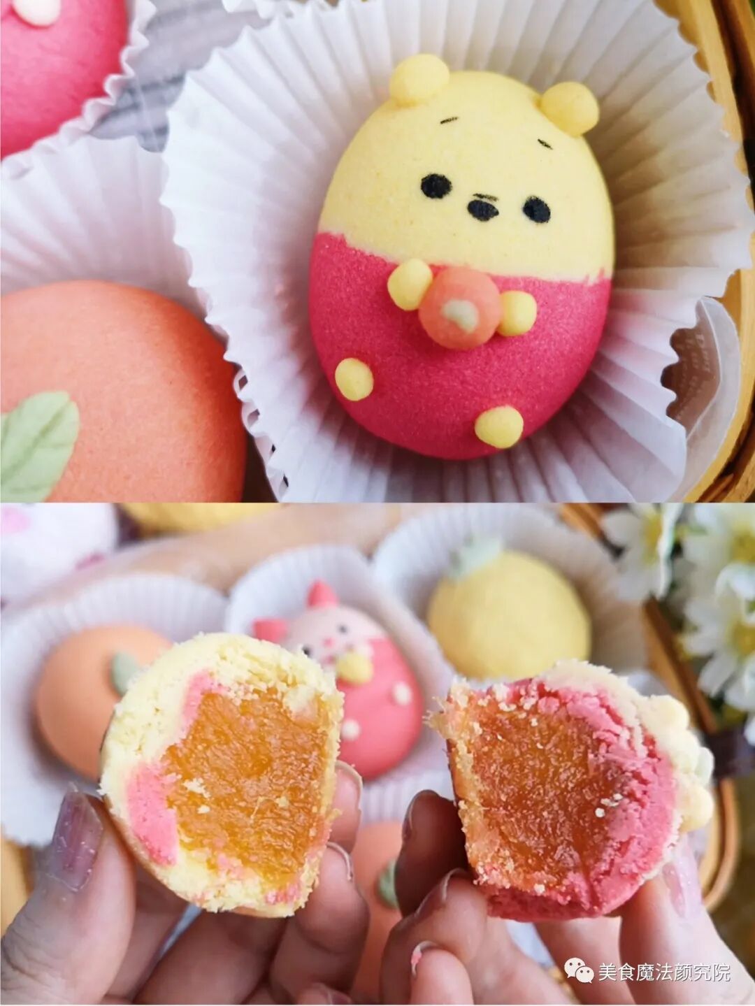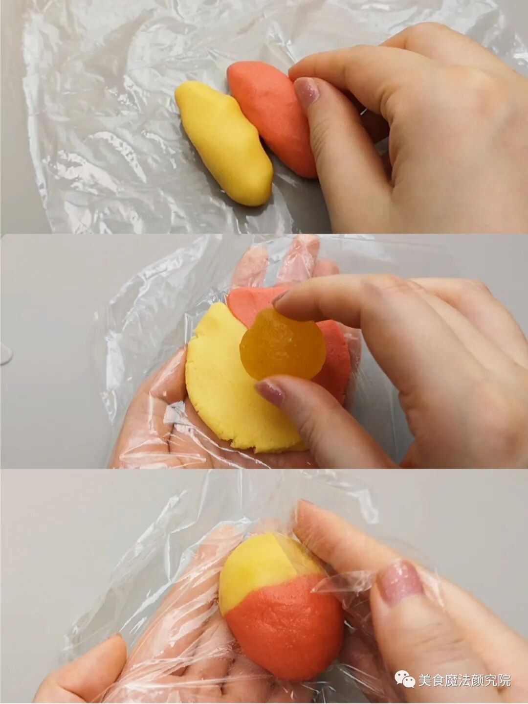 黄色:50克面团+南瓜粉 红色:32克面团+红丝绒液 粉色:16克面团+仙人掌粉 橙色:31克面团+红丝绒液+南瓜粉 绿色:3克面团+抹茶粉
