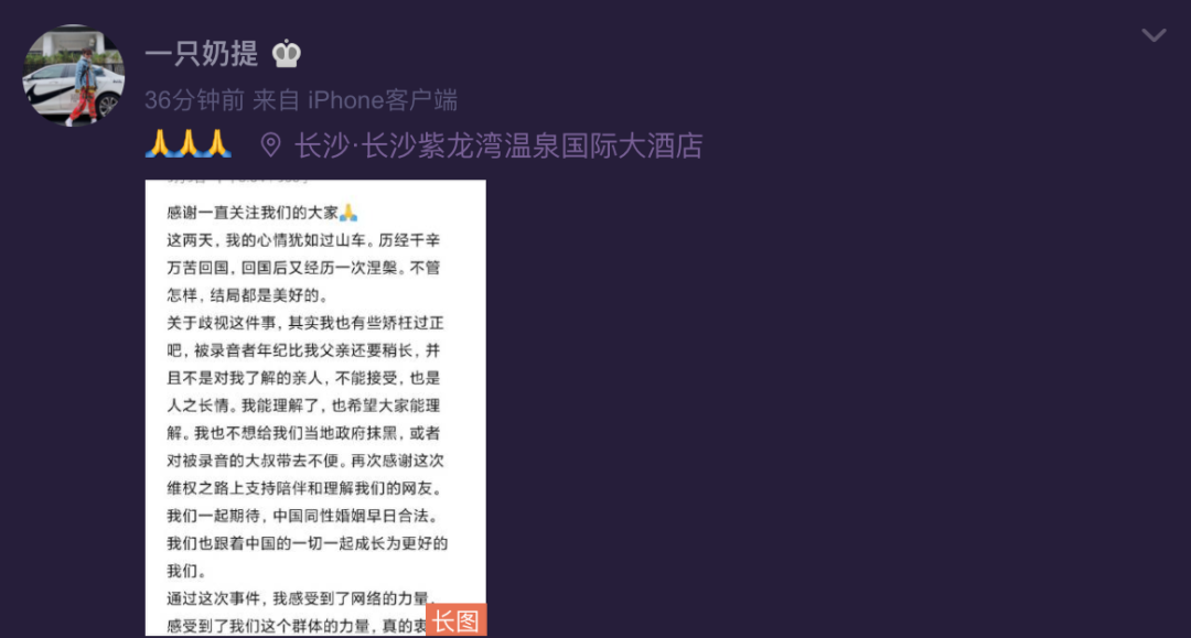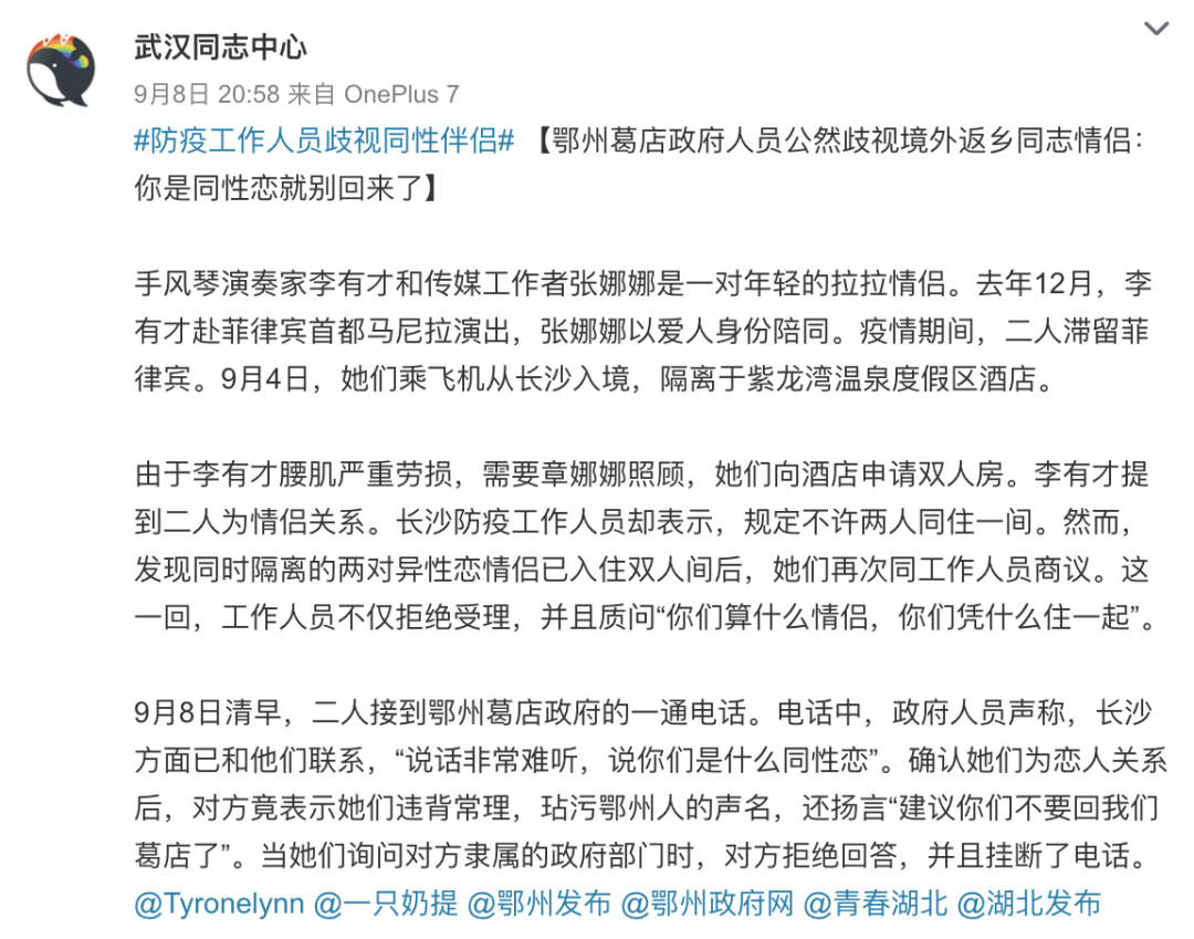 随后,事件引起了注意,专注于武汉及周边地区同志(LGBT)社群服务和公众教育的公益组织 @武汉同志中心 也对当事人做了采访。