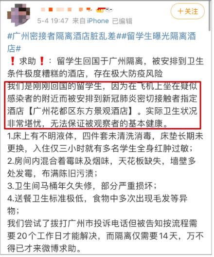 五月份回国落地广州,被分配到满是霉菌的广州花都区东方景观酒店的一些同学,由于环境过于脏乱差,身上甚至起了红疹。
