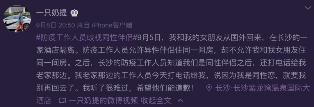而在得知@一只奶提 和其女朋友是同性恋人之后,隔离酒店工作人员或防疫人员转手就把她们的个人信息告知两人家乡政府部门的举动,更是没有任何依据。