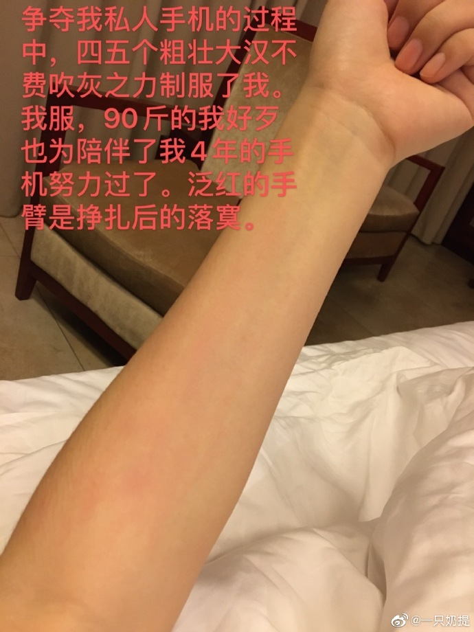 甚至,博主@一只奶提 还称,当她和酒店工作人员出现矛盾时,酒店方面防止录音,不仅抢走了她的私人手机,还直接派出几名大汉将她制服。