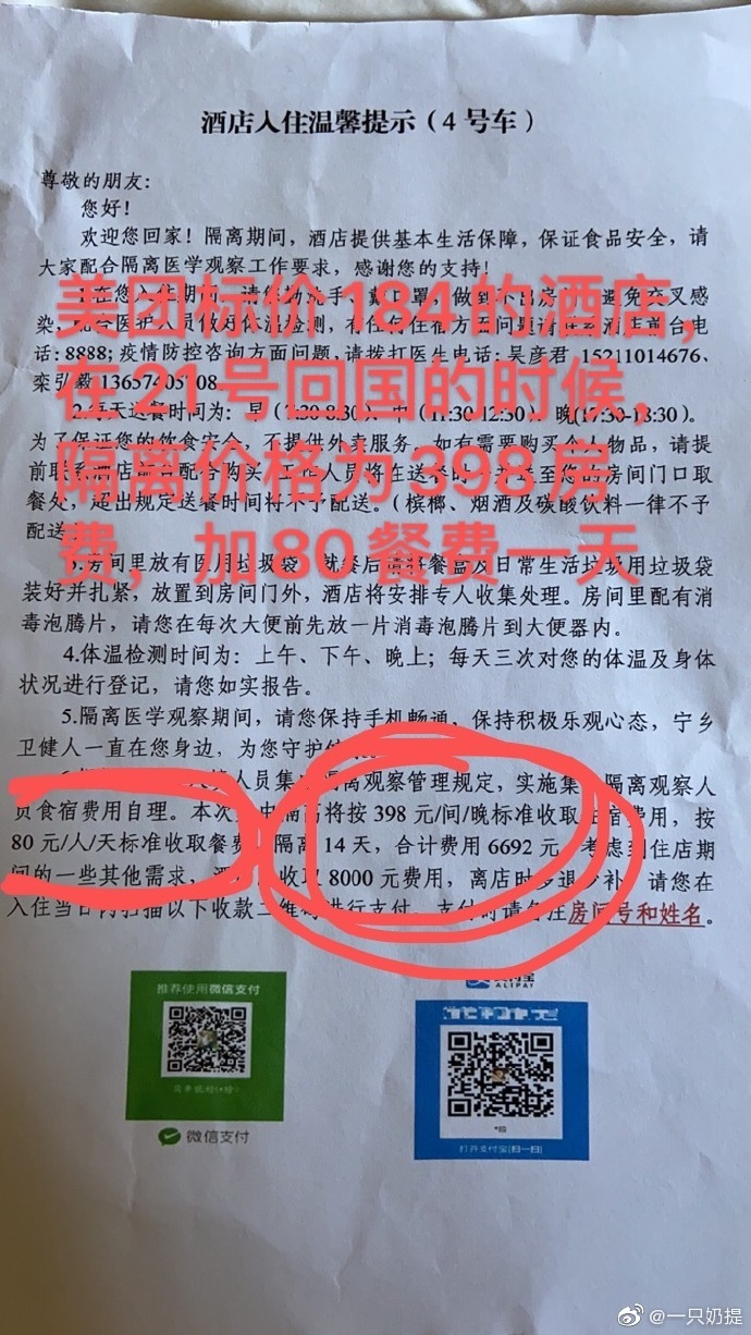 昨天,微博博主 @一只奶提 曝光了自己在回国隔离期间令人气愤的遭遇。
