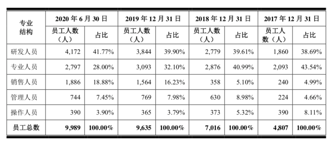 与此同时,重视研发也可以在京东的员工比例中看出来。截至2020年6月30日,京东数科共有在岗员工数9989人,其中研发人员及专业人员占到公司员工总数的比例约为70%。