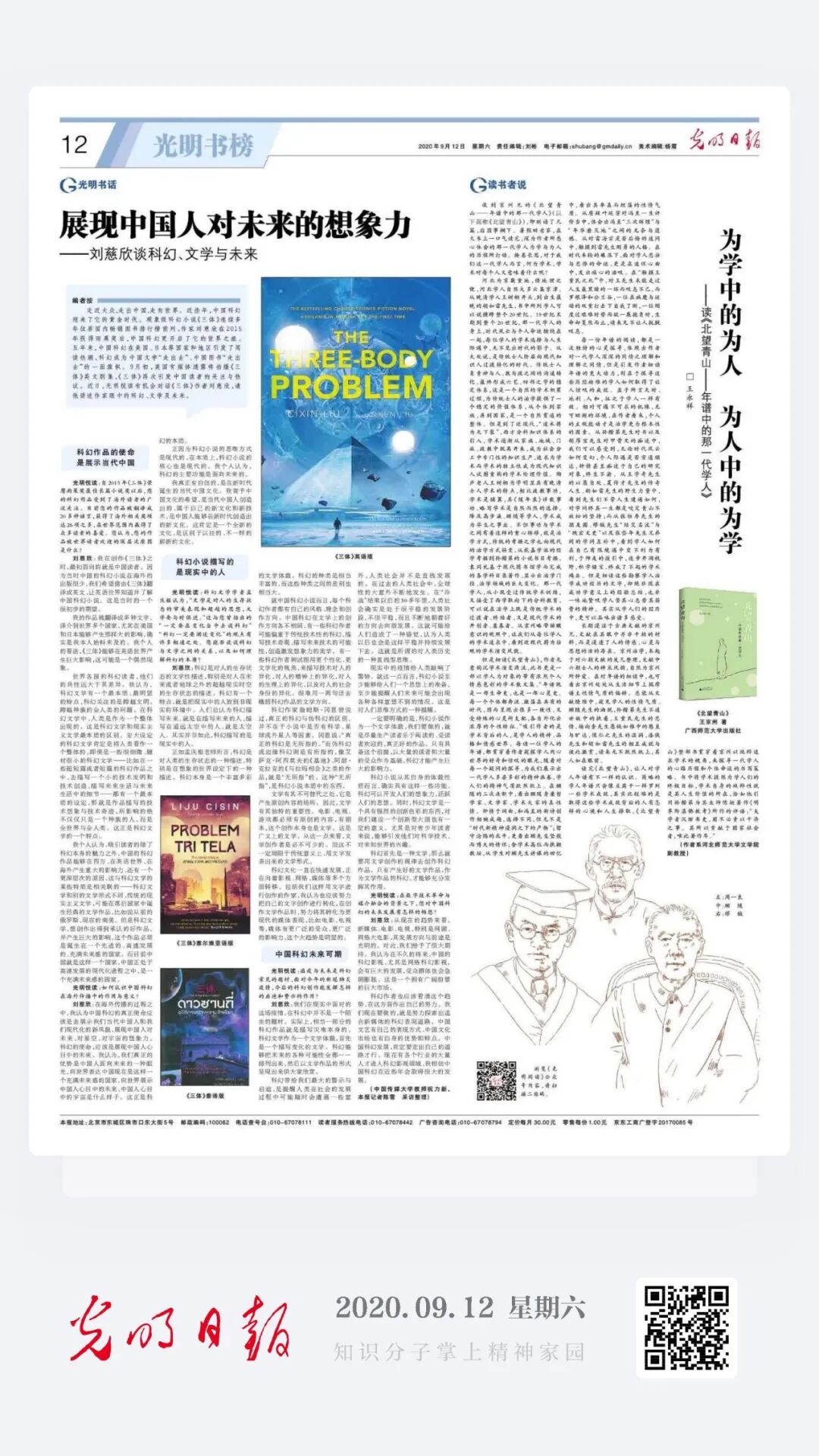 走近大众,走出中国,走向世界。近些年,中国科幻迎来了它的黄金时代。现象级科幻小说《三体》连续多年位居国内畅销图书排行榜前列,作家刘慈欣在2015年获得雨果奖后,中国科幻更开启了它的世界之旅。五年来,中国科幻在美国、日本等国家和地区引发了阅读热潮,科幻成为中国文学“走出去”、中国图书“走出去”的一面旗帜。9月初,美国有媒体透露将拍摄《三体》英文剧集,《三体》再次引发中国读者的关注与热议。近日,光明悦读有机会对话《三体》作者刘慈欣,请他讲述作家眼中的科幻、文学及未来。光明悦读:自2015年《三体》荣膺雨果奖最佳长篇小说奖以后,您的科幻作品受到了海外读者的广泛关注。目前您的作品被翻译成20多种语言,获得了海外相关奖项达26项之多,在世界范围内赢得了众多读者的喜爱。您认为,您的作品被世界读者欢迎的深层次原因是什么?刘慈欣:我在创作《三体》之时,最初面向的就是中国读者。因为当时中国的科幻小说在海外的出版很少,我们希望借由《三体》翻译成英文,让英语世界知道并了解中国科幻小说。这是当时的一个很初步的期望。我的作品被翻译成多种文字,译介到世界多个国家,尤其在美国和日本能够产生那样大的影响,确实是我本人始料未及的。我个人的看法,《三体》能够在英语世界产生巨大影响,这可能是一个偶然现象。图源:微博 @三体宇宙TBU