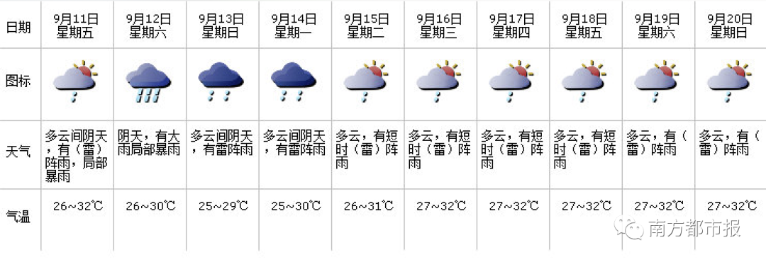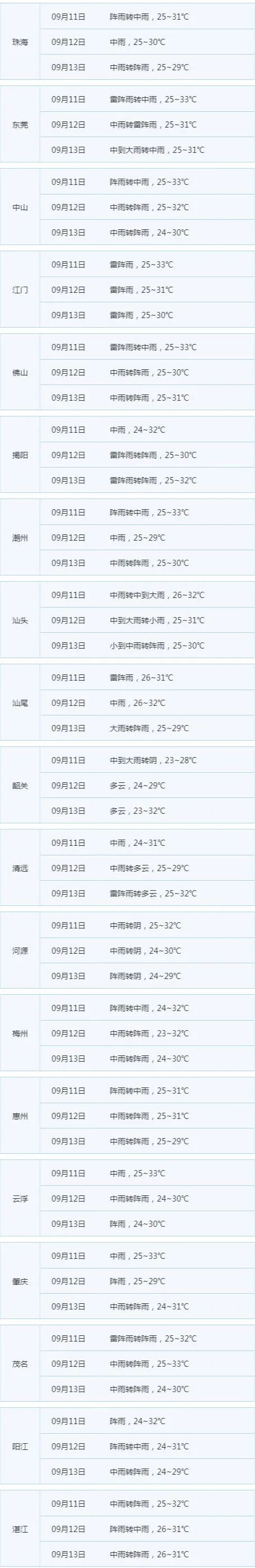 11日,粤北、珠三角北部市县有中到大雨局部暴雨,雷雨时局地伴有8级左右短时大风,粤西和珠江口附近市县有中雨局部暴雨,其余市县多云,有分散(雷)阵雨。最高气温:南部市县30~32℃,其余市县32~34℃。