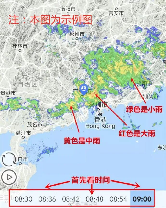 从绿色—黄色—红色—紫色,降雨强度逐渐增强: 1.绿色时,会有小雨。 2.黄色时,雨已让人感觉有些急,雨水会打湿你的裤脚。 3.红色时,雨水倾盆下,雨伞不一定撑得住,还可能伴有短时雷雨大风、冰雹等强对流天气。 4.紫色时,这时估计连雨伞都不能打了,降雨强度非常大,一般伴有雷暴、大风,甚至冰雹,要找地方躲避。可以将图中的降水区当做是一个运动员,根据每个时次它的位置和移动情况,你可以粗略知道它将到哪里去。