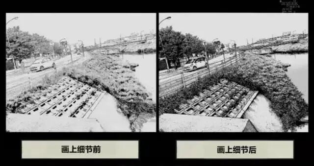 首先他会前往实地拍摄大量照片,然后从中选取出角度和色彩最合适的一张。在将其处理成黑白风格并调整为适当的色调后,浅野老师会在打印好的场景上添加手绘细节,以增加手绘质感。