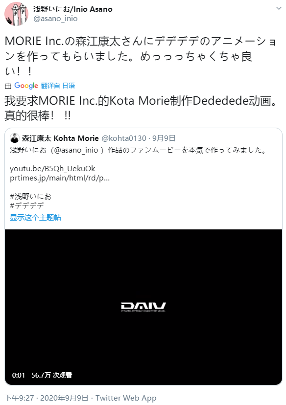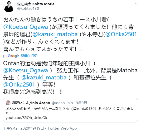 本次《恶魔的破坏》宣传动画发布后,浅野老师在推特上对森江康太的作品表达了高度的赞扬。