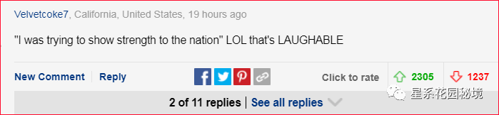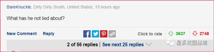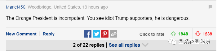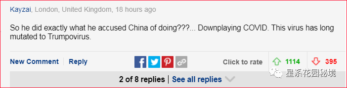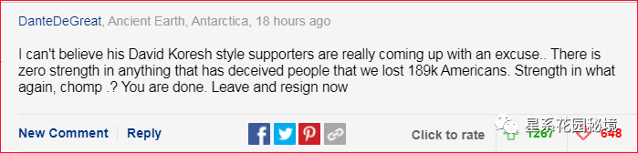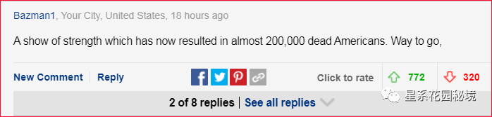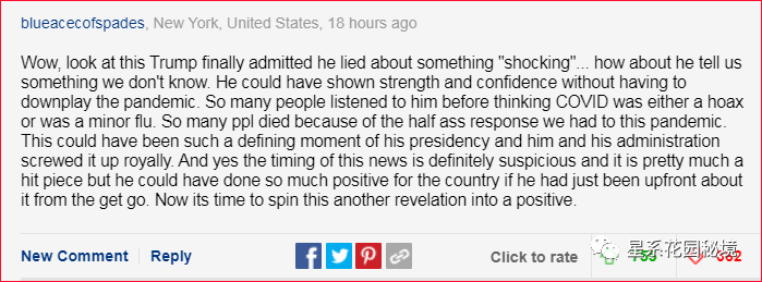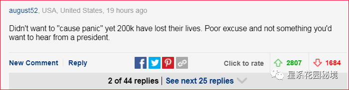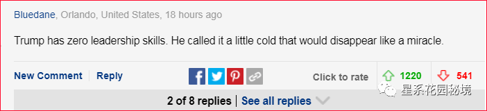 高赞回帖,不只是高赞,而且也往往是反对最多的回帖;这说明在疫情这件事儿上,川普支持者们的裂痕有多大……(DM留言区几乎99%是民主党的反对者,这也导致DM被评为极右平台)