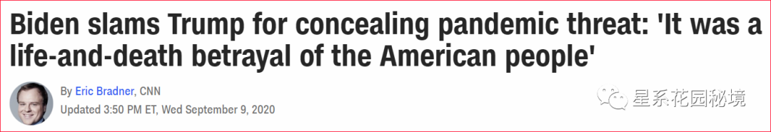 在记者鲍勃·伍德沃德的新书《愤怒》出版前数小时,民主党总统候选人拜登突然在演讲中声讨总统川普“对美国人民生命的背叛”,“源于川普隐瞒了冠状病毒构成的真正威胁。”