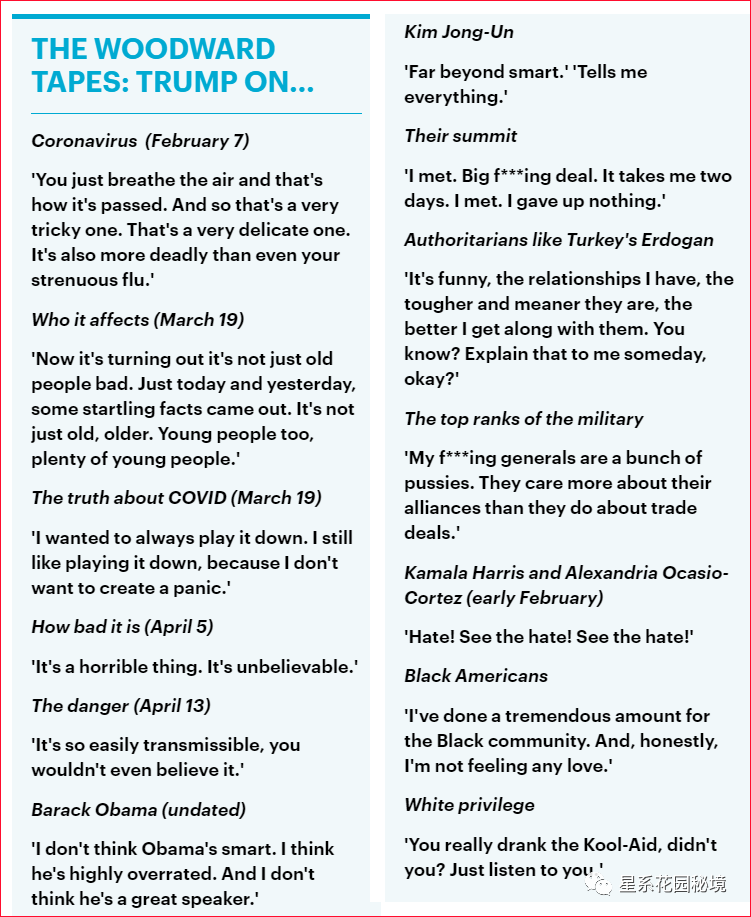 在周三下午伍德沃德披露的录音采访中,川普数十次谈到他对遍布美国的“假新闻”媒体的蔑视,他与伍德沃德畅谈了他对病毒的内心想法,以及,与金先生先生的私人对话,尽管,他曾将伍德沃德早前的一本书称为“对公众的欺骗”,但他依然尽可能在说服这位记者理解自己的立场…当然现在川普支持者们会发现总统犯下一个天大的错误,他又信错了人。