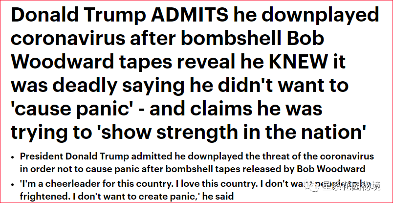2020年9月9日,各大英语媒体刊发了资深记者鲍勃·伍德沃德发布的他与川普的录音并引发轰动效应之后,总统亲口承认他隐瞒了冠状病毒的威胁,淡化威胁目的是避免引起美国社会恐慌…展现美国的国家力量…