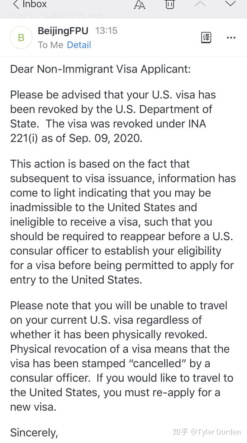 这封由BeijingFPU@state.gov邮箱发送的邮件,通知收信人依据INA 221(i),他们的美国签证被取消了。