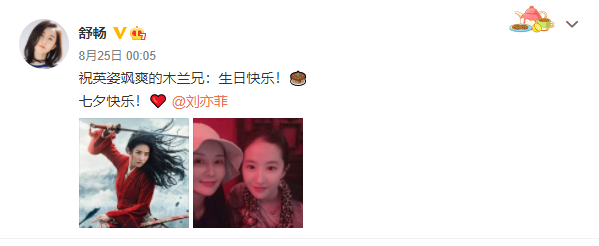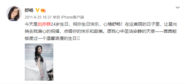 和舒畅,两人同年出生,因合作《金粉世家》而认识,相识于微识,此后就一直保持着联络,相亲相爱了整整17年。每年刘亦菲生日,舒畅总会及时送上祝福,没有一次落下过。