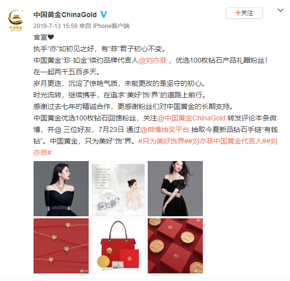 去年已经走过了七年之痒,继续续约。续约当日,中金还走心发布小长文——执手“亦”如初见之好,有“菲”君子初心不变,并豪掷100颗钻石以示庆祝!