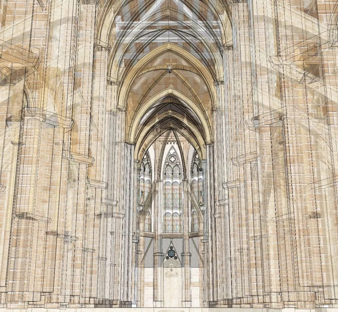 每根方柱的四面贴着一圈小圆柱成为集束柱,集束柱延伸经过15米高的柱头后,又向上散射出尖形的券,这些券相互交叉后汇集到拱顶的最高点,形成教堂的“骨架”。