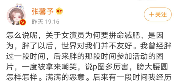 张馨予呼吁不要对女演员胖瘦太苛刻,为什么因为胖就要遭受更多的恶意?