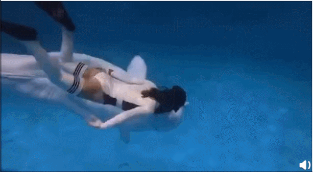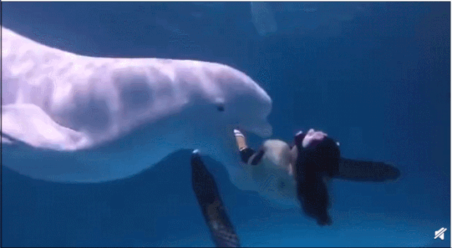 这段视频来自宁波海洋世界,在一段鲸人共游的表演过程中,白鲸时而张嘴威胁,时而啃咬攻击。