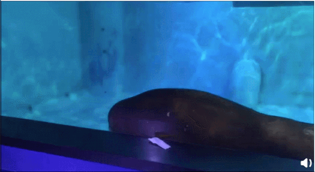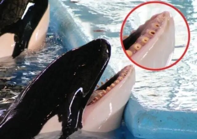 表演结束后,只能蜗居在狭小的泳池里,身体无法挺直,脾气也越发暴戾,甚至出现了啃食护栏和内壁等怪异举动: