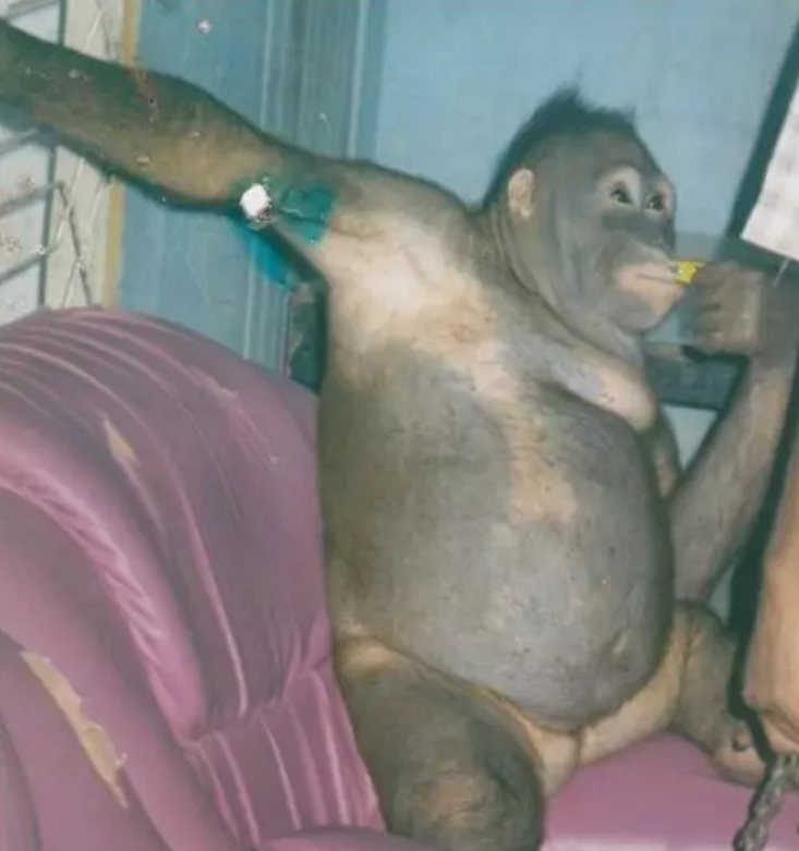 “聪明”的人类在靠墙处用铁链把它的脖子吊起来,在这种极端不平衡的状态下,四肢爬行的它难受得来回踱步,被迫学会了后腿站立。