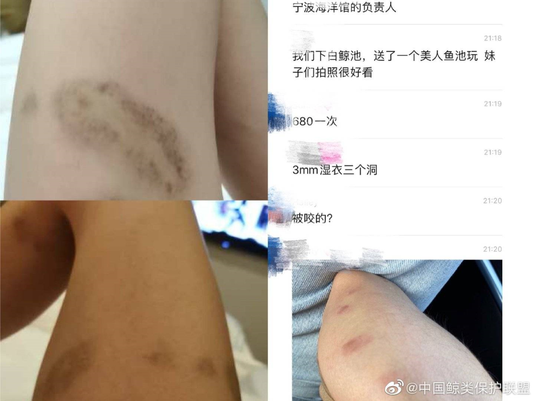 从后续反馈的图片可以看到,即使是隔着3mm厚度的潜水服,潜水员的身上依然留下了多处白鲸啃咬的淤青和痕迹: