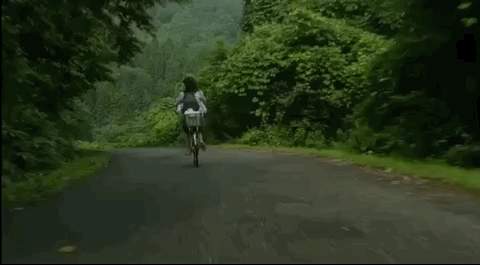 女主角在乡村小道上骑自行车,从树林间骑到田坎上,满眼的绿色,什么都不用想。