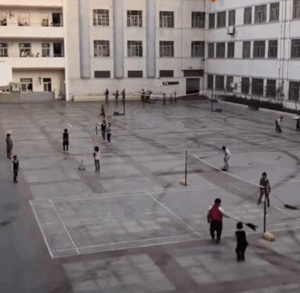 有小男孩拿着扫把转圈圈,有人拖着拖把满操场跑。