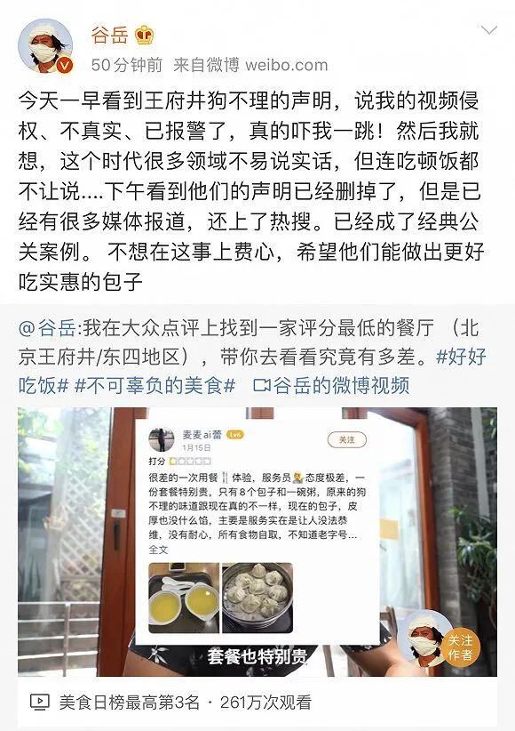 视频发出不久,微博账号“王府井狗不理店”就发布声明称,该视频所有恶语中伤言论均为不实信息,视频发布者侵犯了餐厅名誉权,餐厅将依法追究相关人员和网络媒体的法律责任。
