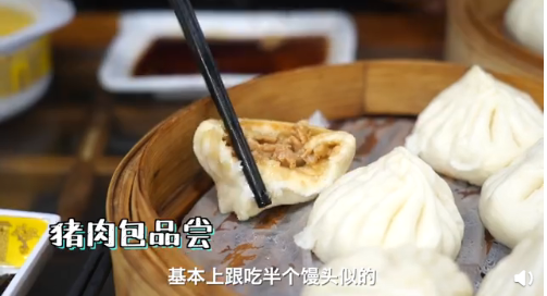 在视频中,“谷岳”花60元购买了一笼8个的酱肉包,又花38元买了一笼8个的猪肉包。品尝后他评价说酱肉包特别腻、没有用真材实料,而猪肉包面皮粘牙,“感觉和吃半个馒头似的”。