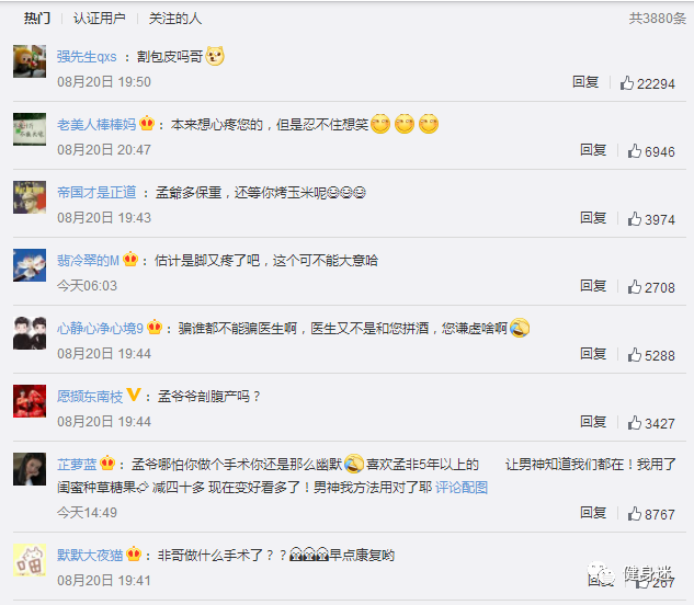 强先生qxs :疼吗哥老美人棒棒妈 :本来想心疼您的,但是忍不住想笑帝国才是正道 :孟爺多保重,还等你烤玉米呢心静心净心境9 :骗谁都不能骗医生啊,医生又不是和您拼酒,您谦虚啥啊愿撷东南枝 :孟爷爷剖腹产吗?芷萝蓝 :孟爷哪怕你做个手术你还是那么幽默