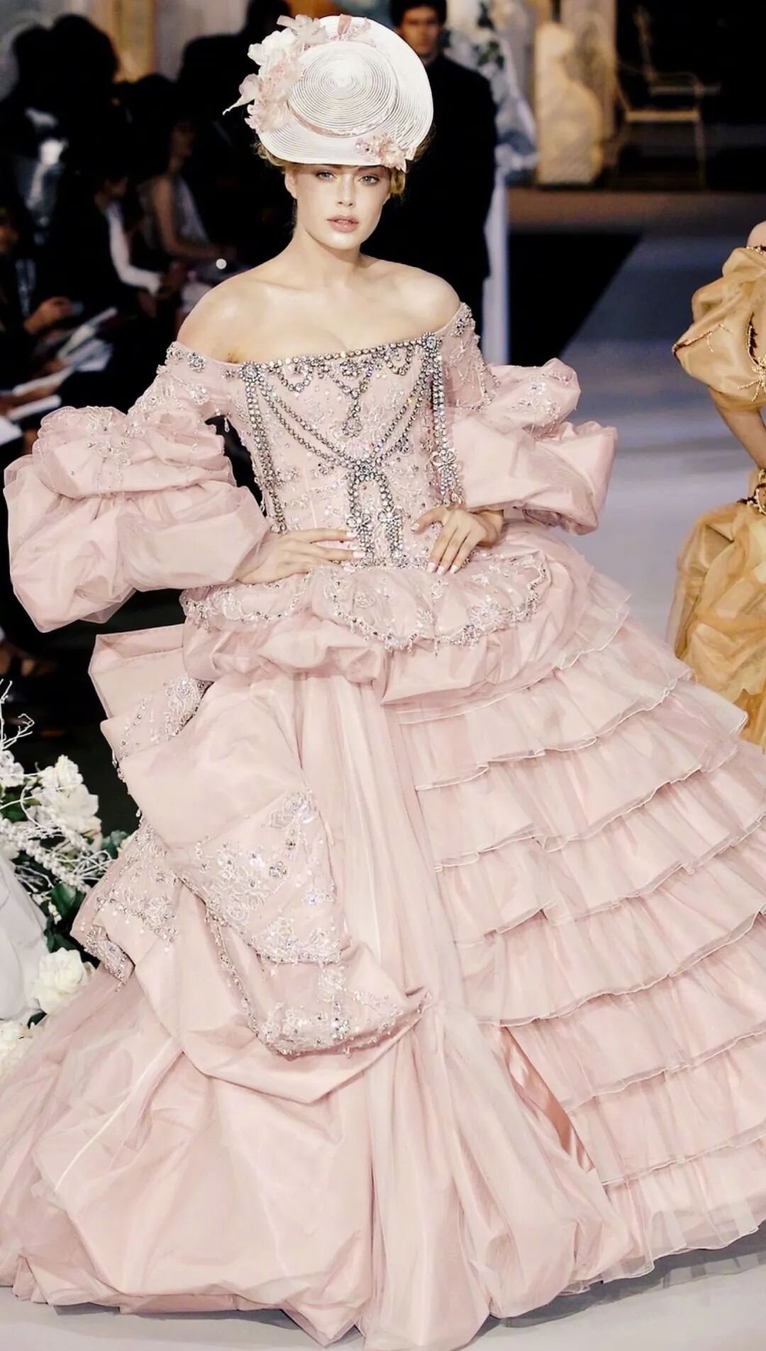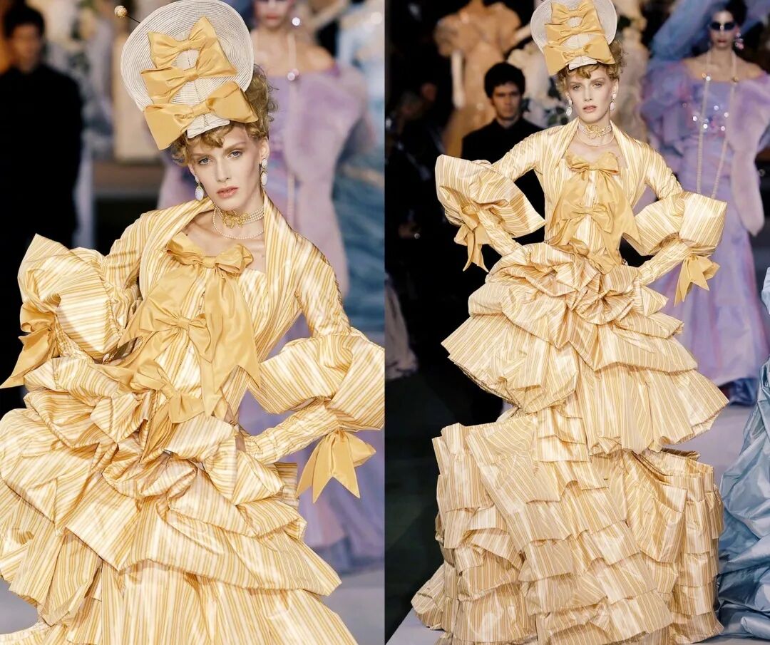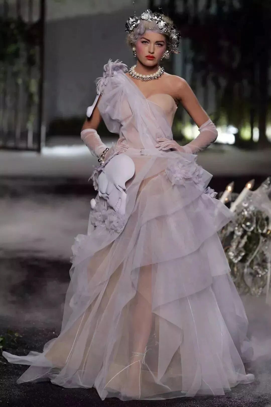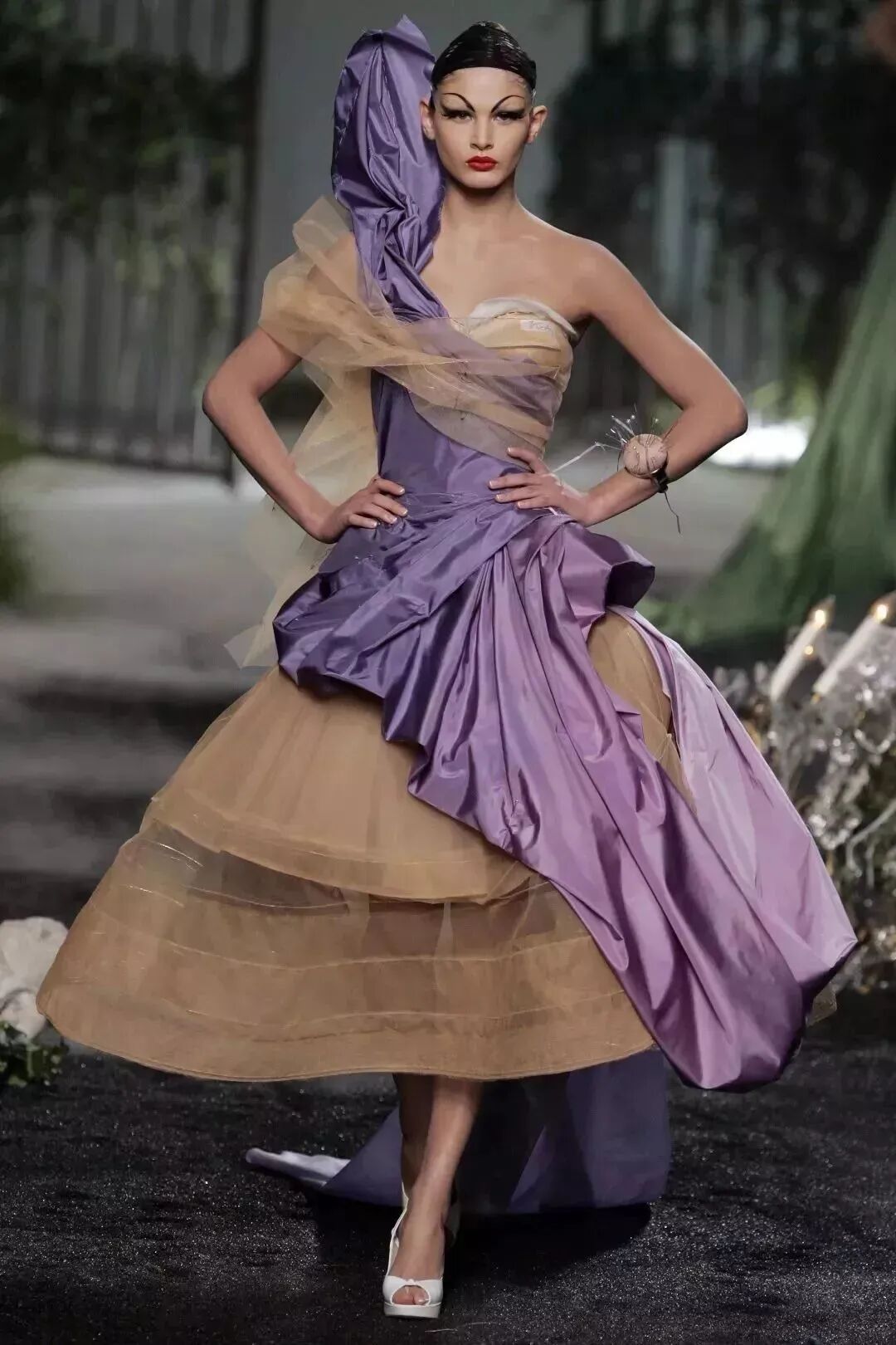 John Galliano汲取了洛可可风格夸张的廓形和繁复华丽的配饰,将这些经典的元素用现代化风格融合在一起,呈现出一场无与伦比的盛宴。
