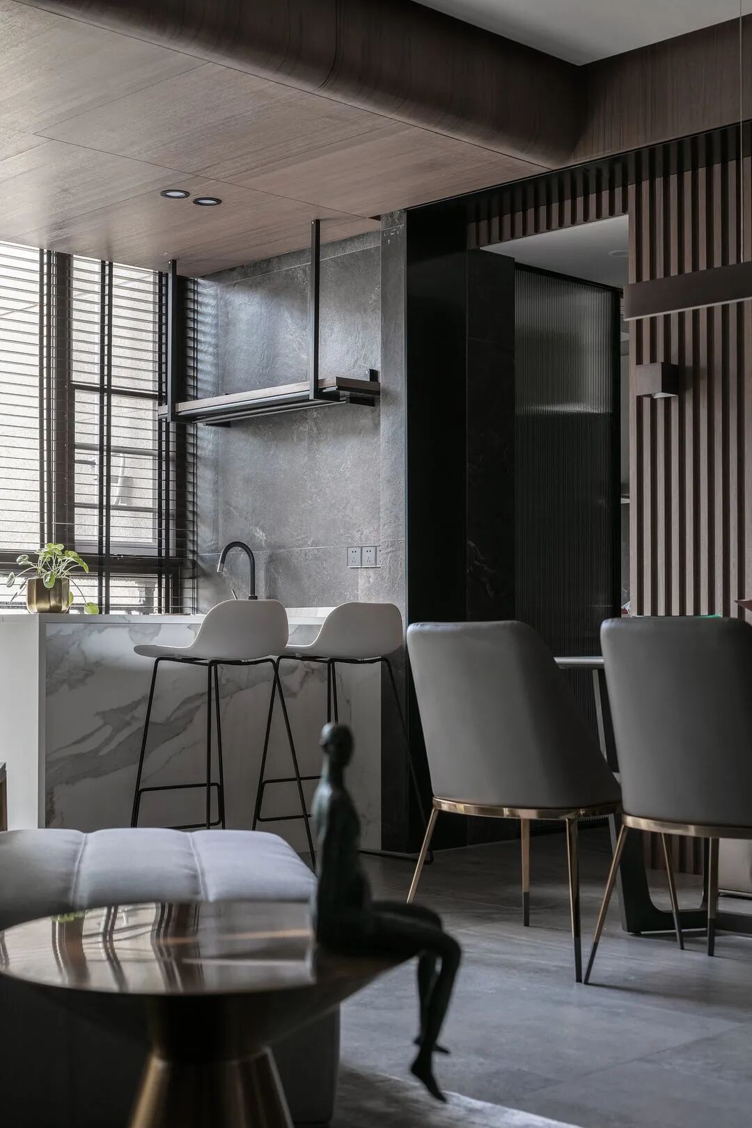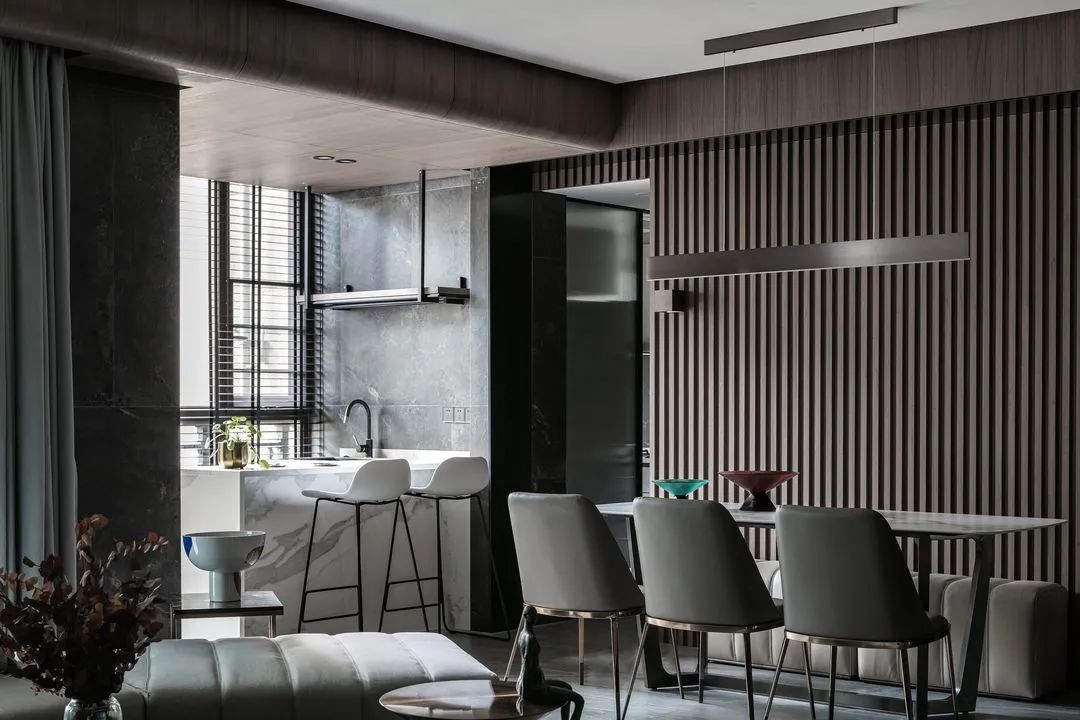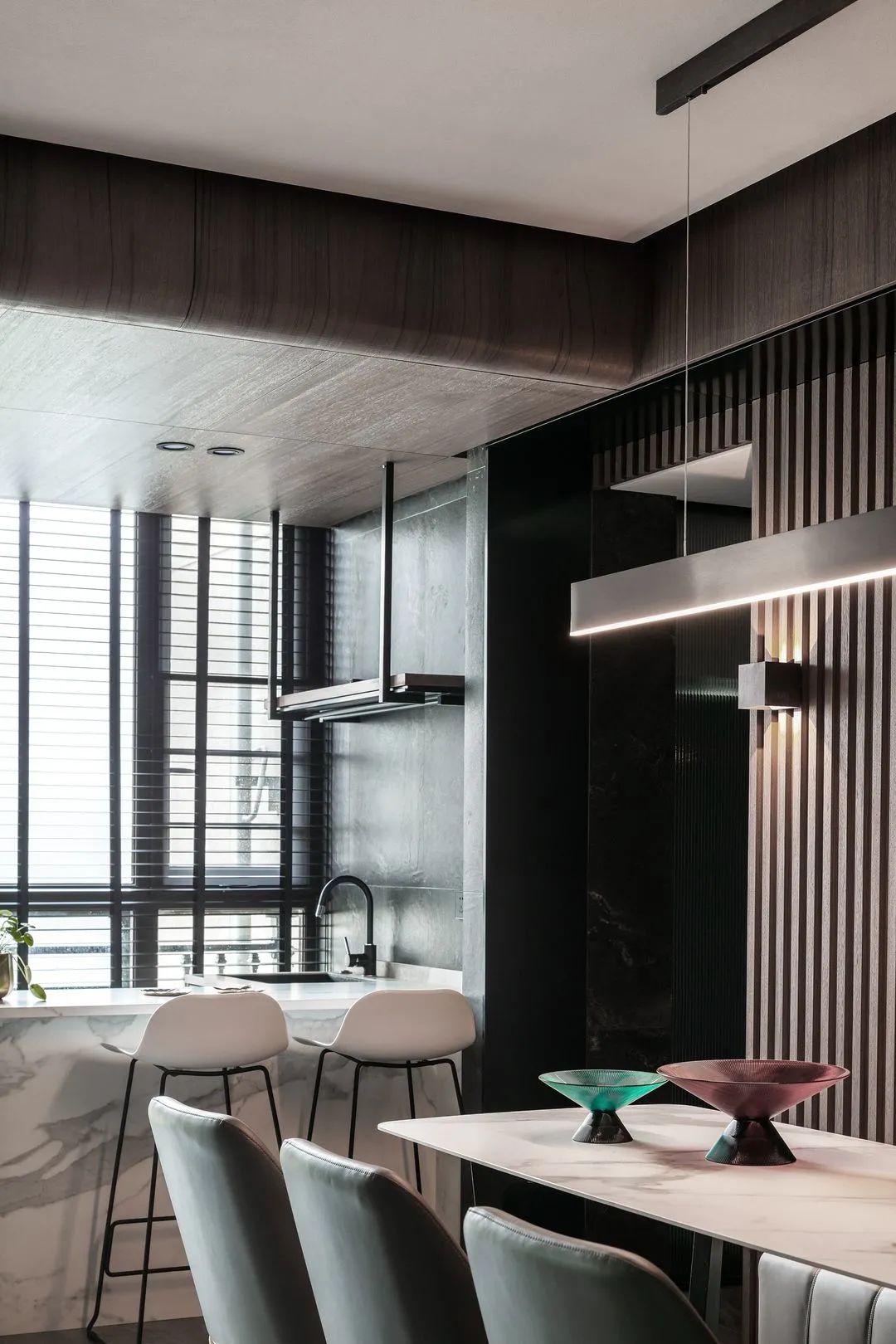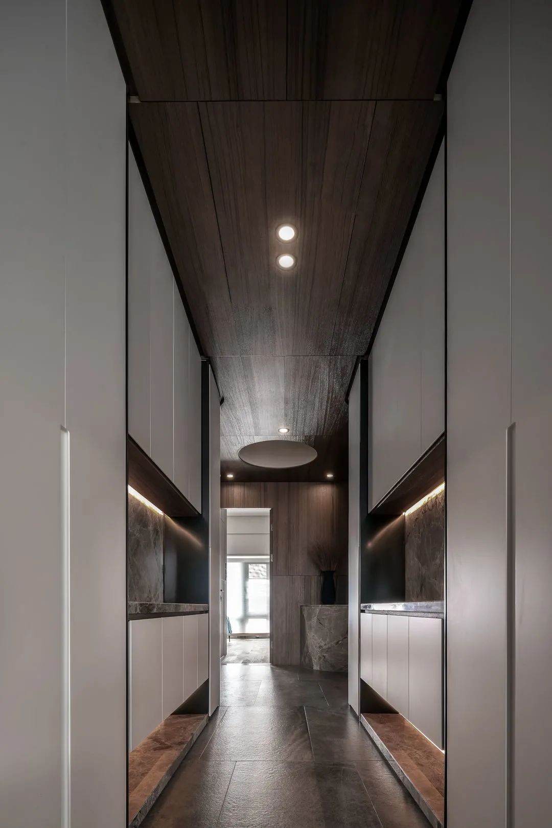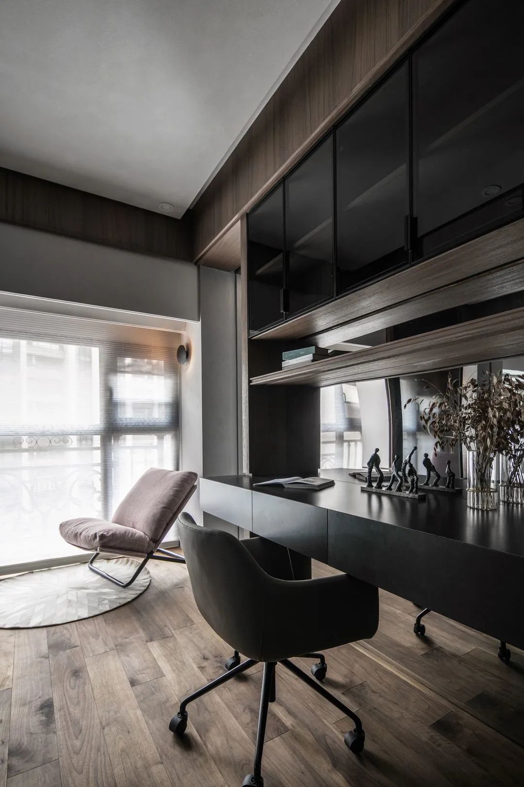 ......屋主对家设计要求高,希望通过设计师的巧思,获得舒适,细节丰富,有设计感以及高质感的空间体验。在设计师的调整下,将各个房间的重新布局,并且根据屋主需求在空间大小上进行分配。在功能分区不变的前提下,重新分配了每个区域的占用面积,整体以客餐厅为主,主卧中包括了衣帽间和书房的功能。两个次卧一间预备作为儿童房,另一间次卧做套间设计,作为双方老人居住的房间。家里对于储物需求大,在入户的左手边的过道两边设置了一整排储物柜,用以平时出入门的物品的放置。过道的尽头是次卧与儿童房,次卧的旁边有两个卫生间。主人家的鞋特别多,两排储物柜可以满足放置。一整排的顶天立地柜,中间一部分柜子下方悬空,底部大理石地台挑高,配合底部暗藏灯带,削弱空间压抑感又扩大了整体空间感。中空可放置杂物、饰品摆设。下方可以放置鞋子。白色烤漆柜门,柜子采用了无把手设计,中空部分采用了大理石台面,吊柜底部为木饰面,两侧用黑色不锈钢收口。木质与大理石的搭配,显得沉稳又有高级感。地面地砖是三分之一工字铺的工艺。电视背景墙为白底灰纹的大理石面,下方为250mm高的抬高,用于放置机顶盒和音响。电视下是木饰面的层板,两侧用黑色不锈钢收边,冷色与暖色的碰撞,以沉稳的黑色作为白色与木色之间的分界,既为效果做缓冲,也使空间更有整体性。电视背景墙设置了一个黑色不锈钢的错层层架,搭配个性的饰品,让这面墙有了生气和活力,同时打破了色彩单一的局面。地面采用的是三分之一工字铺的仿岩板地砖,黑色的双人沙发与黑色的电视背景墙相呼应。搭配两个白色抱枕,让空间色调有跳脱感。客厅以灰色的可活动三人沙发为主,黑色的圆形茶几,搭配金属面的落地灯和果盘摆件,让整个空间显得高级又耐看。搭配灰白色的地毯,空间的色彩一下子丰富起来了。在电视背景墙左边那一块为吊轨移门设计,材质为黑色岩板,重量达三百多斤。由我们的施工队的师傅现场安装。轨道从大门边起,到电视背景墙边黑色不锈钢为止。图为客厅灯光全开的样子,在白天,这个户型采光非常棒。客厅做了大平顶无主灯设计,四周留反光灯槽装灯带,吊顶为白色涂料,吊顶上装筒灯。图为移门关闭后的效果,作为动区与静区的隔断,黑色岩板更厚实、更隔音。如图上所见,电视背景墙下发光的部分是蒸汽壁炉,给整体沉稳的色调带来了一丝烟火气。沙发后面的一整排的柜子,玻璃的窄边黑框门和木饰面的层板相得益彰,展示着主人家的心爱之物,可以看出层板加厚,内嵌暗藏灯带。乐高迷都想要这样子的展示柜。餐厅采用了卡座+单椅的模式,以满足未来人口的增加,也可满足休息日时的小聚会。靠墙的是皮质的灰色卡座,十分舒适,皮质的餐椅,黄铜色的金属细脚,与客厅沙发边几呼应。显得更加有高级感。灰色的卡座,餐桌背景墙为木格栅造型,与餐桌台面的色彩形成了对比。卡座两侧放置这两盏方形壁灯,暖黄色的灯光与木色是绝佳搭配。墙面为黑色瓷砖,台面为大理石纹路的白色岩板,细脚铁艺高脚凳搭配白色岩板吧台,一切显得那么素净又优雅。台上放置一个黄铜色金属面的小花盆,一抹绿意让吧台区显得更加休闲、惬意。弧形的木饰面吊顶,区分客餐厅与阳台休闲区域,与餐厅的背景木饰面呼应,让吧台区域显得更加放松,业主与三两好友坐在窗台边,品着美酒,迎着丝丝缕缕的阳光,整个场景显得十分有仪式感。将客厅的小阳台打通,整面墙落地窗配合两边封闭的墙面,形成一个小空间,景色以及采光极好,作为吧台区再合适不过。无论是用餐还是与好友闲聊座谈,都能享受窗外的美景。保留大阳台作为景观阳台。吧台墙面上为现场制作的层板置物架,墙面为黑色瓷砖。从右边进入厨房的墙面用了黑色不锈钢做了过渡。厨房为封闭式厨房,采用了长虹玻璃门作为隔断,既美观又实用。将厨房与小阳台中间的墙体打掉,将阳台融入厨房里,整个空间的利用率提高了许多,光线也十分好。厨房采用了u字形的布局,整体智能化家电。大家电均为嵌入式电器,考虑到业主爱热炒,采用的是封闭式厨房的形式。墙面为哑光石材,橱柜柜门都是灰色岩板,台面为白色岩板,地面为防岩板地砖。单厨房电器便花费三十多万。在这6平米的厨房的功能性与颜值并存。床头背景墙整面为木格栅,搭配棕色的床头硬包,上方暗藏灯带。吊灯刷白,周围一圈暗藏灯带。床头两侧搭配了小巧精致的圆环形状的吊灯。整体效果优雅,让人身心放松。落地的玻璃窗搭配日夜帘,透入的阳光柔和又浪漫,温润了空间的温度,也提升了舒适度。床头吊灯可以把床头柜的空间释放出来,圆环形状的吊灯散发着暖暖的黄色灯光,使得主卧有了温度的感觉,从而与客厅的简约高冷的格调区分开。简单的圆环造型吊灯又让整屋的风格有了联系。灰色的圆形床头柜更加柔和,避免磕碰。灰色也与整体风格相呼应,也在视觉效果上显得低调、沉稳。地面为木地板,与墙上的木格栅呼应。一切显得自然、纯粹。在主卧做了套房设计,将书房、衣帽间合二为一,保留在主卧空间内。以电视背景墙作为分隔,主卧的电视背景墙为柜体式的背景墙,白色烤漆柜门,搭配黑色钢板,下空的位置用大理石纹路的白色岩板做了一个抬高处理。整体显得简洁利落。很舒适的一个角落,主卧里的书房衣帽间区域的落地窗,搭配一