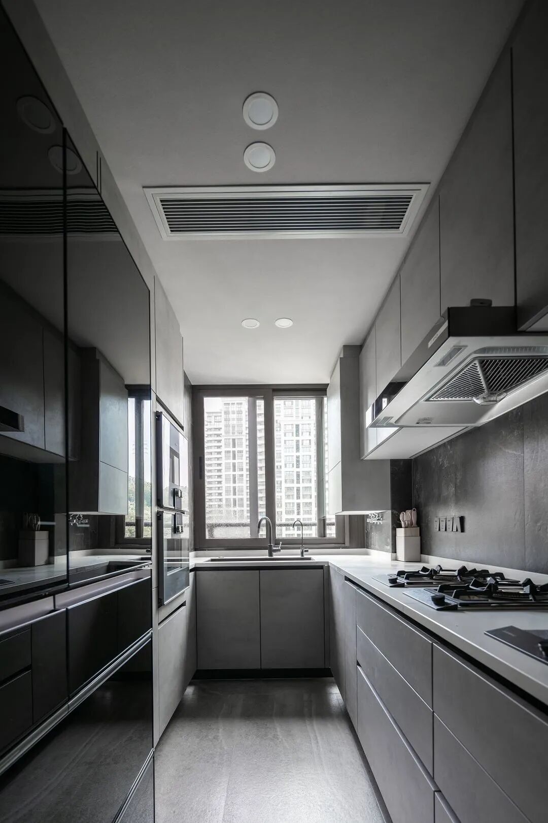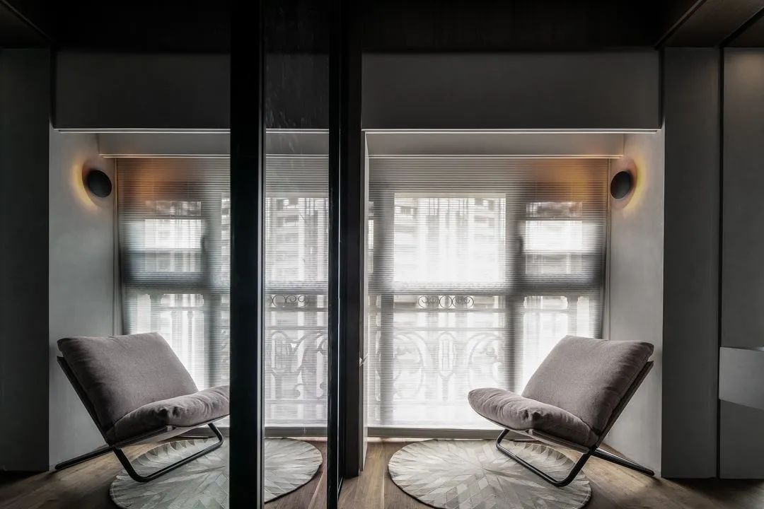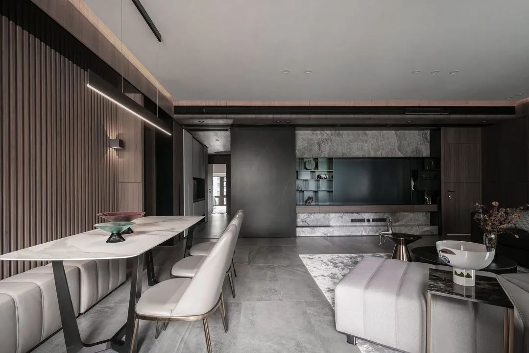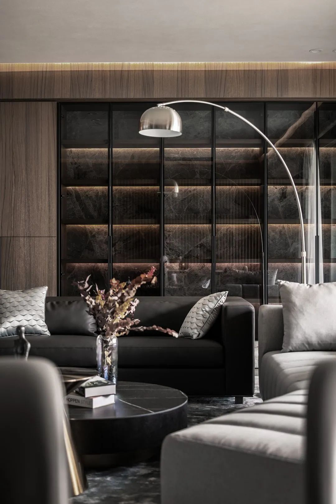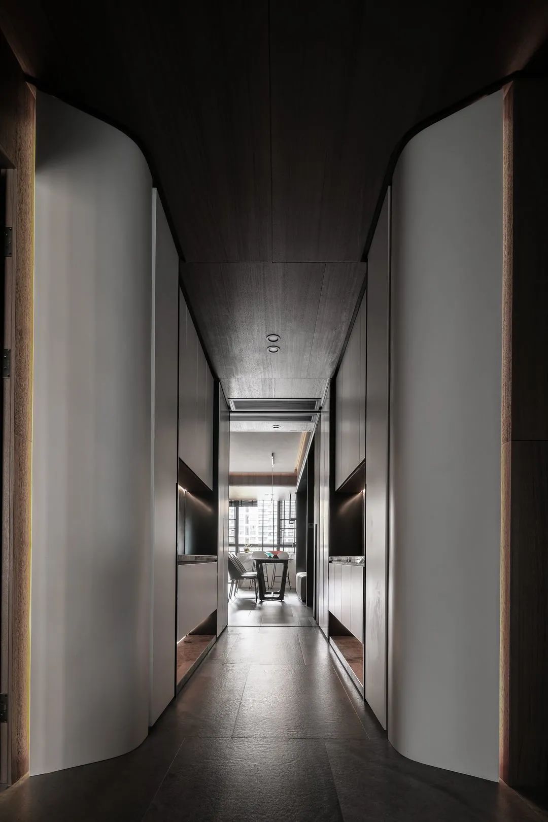 ......屋主对家设计要求高,希望通过设计师的巧思,获得舒适,细节丰富,有设计感以及高质感的空间体验。在设计师的调整下,将各个房间的重新布局,并且根据屋主需求在空间大小上进行分配。在功能分区不变的前提下,重新分配了每个区域的占用面积,整体以客餐厅为主,主卧中包括了衣帽间和书房的功能。两个次卧一间预备作为儿童房,另一间次卧做套间设计,作为双方老人居住的房间。家里对于储物需求大,在入户的左手边的过道两边设置了一整排储物柜,用以平时出入门的物品的放置。过道的尽头是次卧与儿童房,次卧的旁边有两个卫生间。主人家的鞋特别多,两排储物柜可以满足放置。一整排的顶天立地柜,中间一部分柜子下方悬空,底部大理石地台挑高,配合底部暗藏灯带,削弱空间压抑感又扩大了整体空间感。中空可放置杂物、饰品摆设。下方可以放置鞋子。白色烤漆柜门,柜子采用了无把手设计,中空部分采用了大理石台面,吊柜底部为木饰面,两侧用黑色不锈钢收口。木质与大理石的搭配,显得沉稳又有高级感。地面地砖是三分之一工字铺的工艺。电视背景墙为白底灰纹的大理石面,下方为250mm高的抬高,用于放置机顶盒和音响。电视下是木饰面的层板,两侧用黑色不锈钢收边,冷色与暖色的碰撞,以沉稳的黑色作为白色与木色之间的分界,既为效果做缓冲,也使空间更有整体性。电视背景墙设置了一个黑色不锈钢的错层层架,搭配个性的饰品,让这面墙有了生气和活力,同时打破了色彩单一的局面。地面采用的是三分之一工字铺的仿岩板地砖,黑色的双人沙发与黑色的电视背景墙相呼应。搭配两个白色抱枕,让空间色调有跳脱感。客厅以灰色的可活动三人沙发为主,黑色的圆形茶几,搭配金属面的落地灯和果盘摆件,让整个空间显得高级又耐看。搭配灰白色的地毯,空间的色彩一下子丰富起来了。在电视背景墙左边那一块为吊轨移门设计,材质为黑色岩板,重量达三百多斤。由我们的施工队的师傅现场安装。轨道从大门边起,到电视背景墙边黑色不锈钢为止。图为客厅灯光全开的样子,在白天,这个户型采光非常棒。客厅做了大平顶无主灯设计,四周留反光灯槽装灯带,吊顶为白色涂料,吊顶上装筒灯。图为移门关闭后的效果,作为动区与静区的隔断,黑色岩板更厚实、更隔音。如图上所见,电视背景墙下发光的部分是蒸汽壁炉,给整体沉稳的色调带来了一丝烟火气。沙发后面的一整排的柜子,玻璃的窄边黑框门和木饰面的层板相得益彰,展示着主人家的心爱之物,可以看出层板加厚,内嵌暗藏灯带。乐高迷都想要这样子的展示柜。餐厅采用了卡座+单椅的模式,以满足未来人口的增加,也可满足休息日时的小聚会。靠墙的是皮质的灰色卡座,十分舒适,皮质的餐椅,黄铜色的金属细脚,与客厅沙发边几呼应。显得更加有高级感。灰色的卡座,餐桌背景墙为木格栅造型,与餐桌台面的色彩形成了对比。卡座两侧放置这两盏方形壁灯,暖黄色的灯光与木色是绝佳搭配。墙面为黑色瓷砖,台面为大理石纹路的白色岩板,细脚铁艺高脚凳搭配白色岩板吧台,一切显得那么素净又优雅。台上放置一个黄铜色金属面的小花盆,一抹绿意让吧台区显得更加休闲、惬意。弧形的木饰面吊顶,区分客餐厅与阳台休闲区域,与餐厅的背景木饰面呼应,让吧台区域显得更加放松,业主与三两好友坐在窗台边,品着美酒,迎着丝丝缕缕的阳光,整个场景显得十分有仪式感。将客厅的小阳台打通,整面墙落地窗配合两边封闭的墙面,形成一个小空间,景色以及采光极好,作为吧台区再合适不过。无论是用餐还是与好友闲聊座谈,都能享受窗外的美景。保留大阳台作为景观阳台。吧台墙面上为现场制作的层板置物架,墙面为黑色瓷砖。从右边进入厨房的墙面用了黑色不锈钢做了过渡。厨房为封闭式厨房,采用了长虹玻璃门作为隔断,既美观又实用。将厨房与小阳台中间的墙体打掉,将阳台融入厨房里,整个空间的利用率提高了许多,光线也十分好。厨房采用了u字形的布局,整体智能化家电。大家电均为嵌入式电器,考虑到业主爱热炒,采用的是封闭式厨房的形式。墙面为哑光石材,橱柜柜门都是灰色岩板,台面为白色岩板,地面为防岩板地砖。单厨房电器便花费三十多万。在这6平米的厨房的功能性与颜值并存。床头背景墙整面为木格栅,搭配棕色的床头硬包,上方暗藏灯带。吊灯刷白,周围一圈暗藏灯带。床头两侧搭配了小巧精致的圆环形状的吊灯。整体效果优雅,让人身心放松。落地的玻璃窗搭配日夜帘,透入的阳光柔和又浪漫,温润了空间的温度,也提升了舒适度。床头吊灯可以把床头柜的空间释放出来,圆环形状的吊灯散发着暖暖的黄色灯光,使得主卧有了温度的感觉,从而与客厅的简约高冷的格调区分开。简单的圆环造型吊灯又让整屋的风格有了联系。灰色的圆形床头柜更加柔和,避免磕碰。灰色也与整体风格相呼应,也在视觉效果上显得低调、沉稳。地面为木地板,与墙上的木格栅呼应。一切显得自然、纯粹。在主卧做了套房设计,将书房、衣帽间合二为一,保留在主卧空间内。以电视背景墙作为分隔,主卧的电视背景墙为柜体式的背景墙,白色烤漆柜门,搭配黑色钢板,下空的位置用大理石纹路的白色岩板做了一个抬高处理。整体显得简洁利落。很舒适的一个角落,主卧里的书房衣帽间区域的落地窗,搭配一