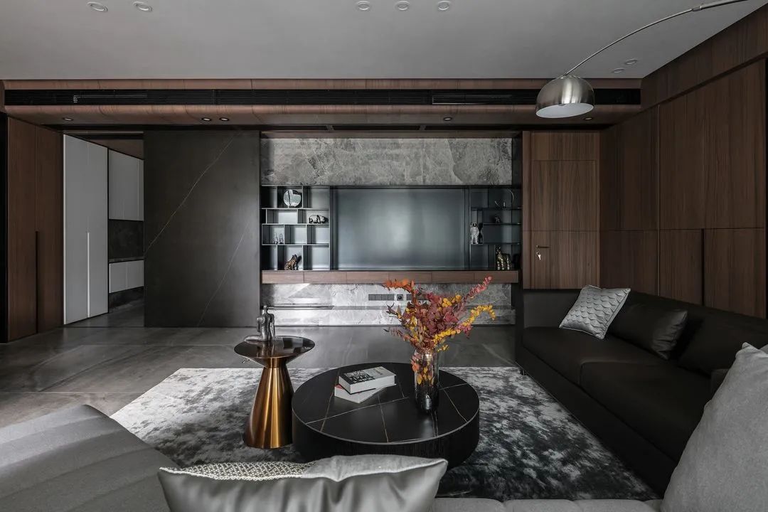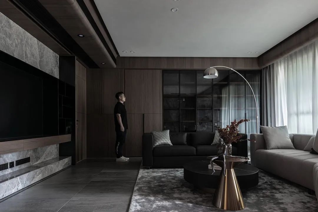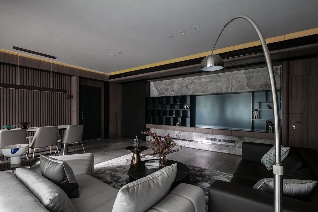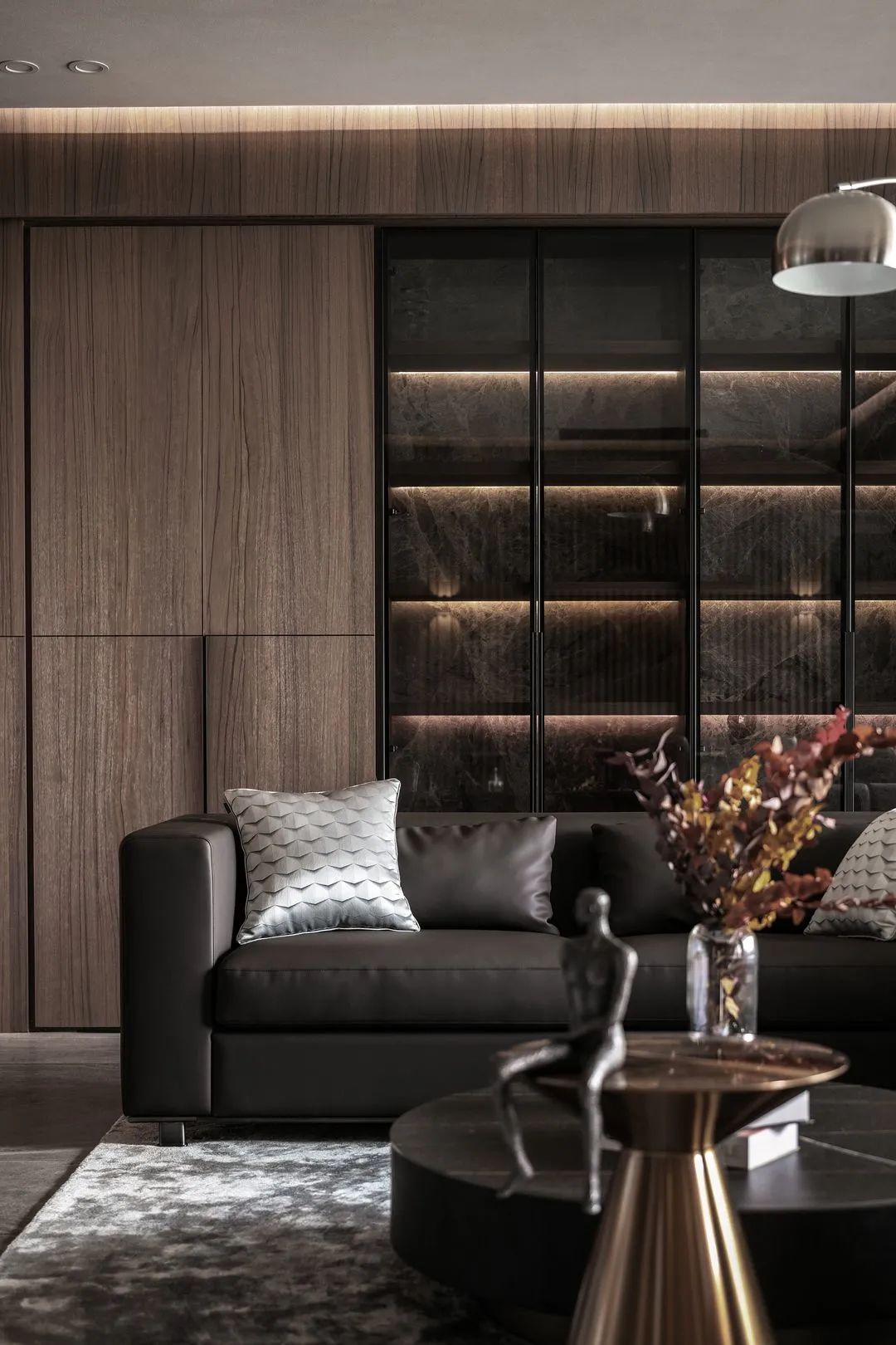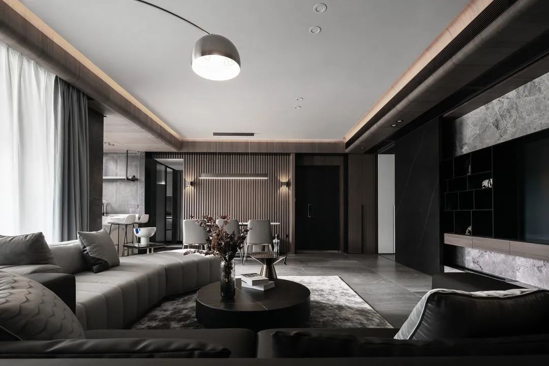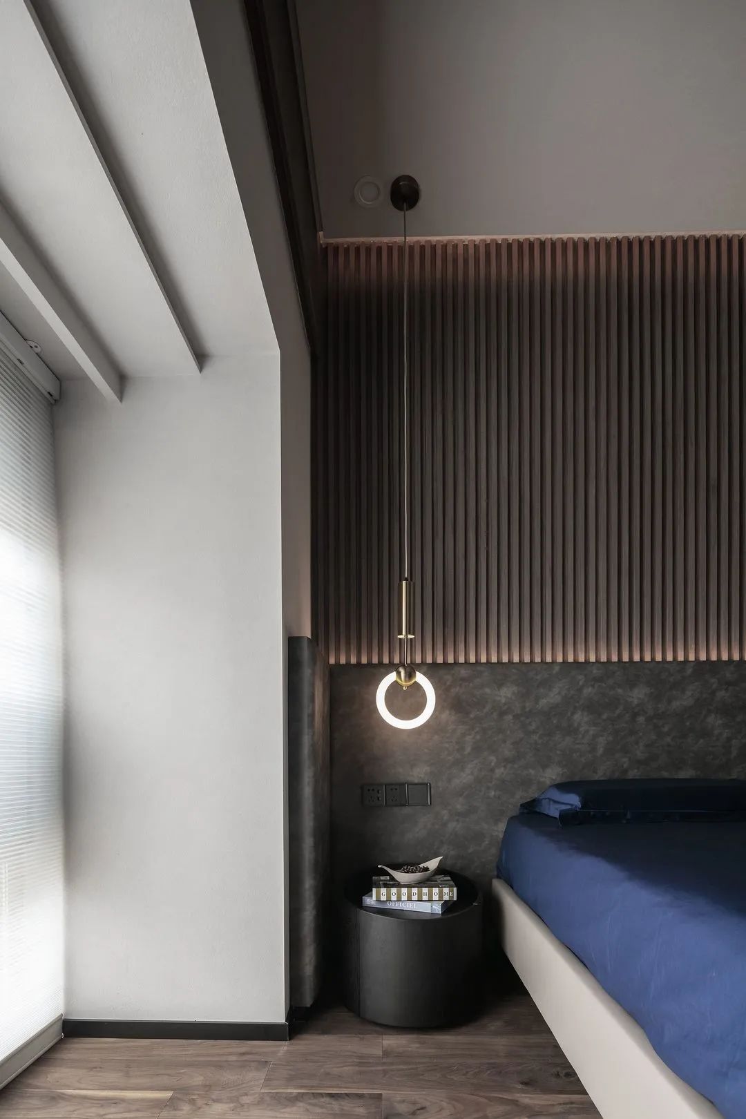 ......屋主对家设计要求高,希望通过设计师的巧思,获得舒适,细节丰富,有设计感以及高质感的空间体验。在设计师的调整下,将各个房间的重新布局,并且根据屋主需求在空间大小上进行分配。在功能分区不变的前提下,重新分配了每个区域的占用面积,整体以客餐厅为主,主卧中包括了衣帽间和书房的功能。两个次卧一间预备作为儿童房,另一间次卧做套间设计,作为双方老人居住的房间。家里对于储物需求大,在入户的左手边的过道两边设置了一整排储物柜,用以平时出入门的物品的放置。过道的尽头是次卧与儿童房,次卧的旁边有两个卫生间。主人家的鞋特别多,两排储物柜可以满足放置。一整排的顶天立地柜,中间一部分柜子下方悬空,底部大理石地台挑高,配合底部暗藏灯带,削弱空间压抑感又扩大了整体空间感。中空可放置杂物、饰品摆设。下方可以放置鞋子。白色烤漆柜门,柜子采用了无把手设计,中空部分采用了大理石台面,吊柜底部为木饰面,两侧用黑色不锈钢收口。木质与大理石的搭配,显得沉稳又有高级感。地面地砖是三分之一工字铺的工艺。电视背景墙为白底灰纹的大理石面,下方为250mm高的抬高,用于放置机顶盒和音响。电视下是木饰面的层板,两侧用黑色不锈钢收边,冷色与暖色的碰撞,以沉稳的黑色作为白色与木色之间的分界,既为效果做缓冲,也使空间更有整体性。电视背景墙设置了一个黑色不锈钢的错层层架,搭配个性的饰品,让这面墙有了生气和活力,同时打破了色彩单一的局面。地面采用的是三分之一工字铺的仿岩板地砖,黑色的双人沙发与黑色的电视背景墙相呼应。搭配两个白色抱枕,让空间色调有跳脱感。客厅以灰色的可活动三人沙发为主,黑色的圆形茶几,搭配金属面的落地灯和果盘摆件,让整个空间显得高级又耐看。搭配灰白色的地毯,空间的色彩一下子丰富起来了。在电视背景墙左边那一块为吊轨移门设计,材质为黑色岩板,重量达三百多斤。由我们的施工队的师傅现场安装。轨道从大门边起,到电视背景墙边黑色不锈钢为止。图为客厅灯光全开的样子,在白天,这个户型采光非常棒。客厅做了大平顶无主灯设计,四周留反光灯槽装灯带,吊顶为白色涂料,吊顶上装筒灯。图为移门关闭后的效果,作为动区与静区的隔断,黑色岩板更厚实、更隔音。如图上所见,电视背景墙下发光的部分是蒸汽壁炉,给整体沉稳的色调带来了一丝烟火气。沙发后面的一整排的柜子,玻璃的窄边黑框门和木饰面的层板相得益彰,展示着主人家的心爱之物,可以看出层板加厚,内嵌暗藏灯带。乐高迷都想要这样子的展示柜。餐厅采用了卡座+单椅的模式,以满足未来人口的增加,也可满足休息日时的小聚会。靠墙的是皮质的灰色卡座,十分舒适,皮质的餐椅,黄铜色的金属细脚,与客厅沙发边几呼应。显得更加有高级感。灰色的卡座,餐桌背景墙为木格栅造型,与餐桌台面的色彩形成了对比。卡座两侧放置这两盏方形壁灯,暖黄色的灯光与木色是绝佳搭配。墙面为黑色瓷砖,台面为大理石纹路的白色岩板,细脚铁艺高脚凳搭配白色岩板吧台,一切显得那么素净又优雅。台上放置一个黄铜色金属面的小花盆,一抹绿意让吧台区显得更加休闲、惬意。弧形的木饰面吊顶,区分客餐厅与阳台休闲区域,与餐厅的背景木饰面呼应,让吧台区域显得更加放松,业主与三两好友坐在窗台边,品着美酒,迎着丝丝缕缕的阳光,整个场景显得十分有仪式感。将客厅的小阳台打通,整面墙落地窗配合两边封闭的墙面,形成一个小空间,景色以及采光极好,作为吧台区再合适不过。无论是用餐还是与好友闲聊座谈,都能享受窗外的美景。保留大阳台作为景观阳台。吧台墙面上为现场制作的层板置物架,墙面为黑色瓷砖。从右边进入厨房的墙面用了黑色不锈钢做了过渡。厨房为封闭式厨房,采用了长虹玻璃门作为隔断,既美观又实用。将厨房与小阳台中间的墙体打掉,将阳台融入厨房里,整个空间的利用率提高了许多,光线也十分好。厨房采用了u字形的布局,整体智能化家电。大家电均为嵌入式电器,考虑到业主爱热炒,采用的是封闭式厨房的形式。墙面为哑光石材,橱柜柜门都是灰色岩板,台面为白色岩板,地面为防岩板地砖。单厨房电器便花费三十多万。在这6平米的厨房的功能性与颜值并存。床头背景墙整面为木格栅,搭配棕色的床头硬包,上方暗藏灯带。吊灯刷白,周围一圈暗藏灯带。床头两侧搭配了小巧精致的圆环形状的吊灯。整体效果优雅,让人身心放松。落地的玻璃窗搭配日夜帘,透入的阳光柔和又浪漫,温润了空间的温度,也提升了舒适度。床头吊灯可以把床头柜的空间释放出来,圆环形状的吊灯散发着暖暖的黄色灯光,使得主卧有了温度的感觉,从而与客厅的简约高冷的格调区分开。简单的圆环造型吊灯又让整屋的风格有了联系。灰色的圆形床头柜更加柔和,避免磕碰。灰色也与整体风格相呼应,也在视觉效果上显得低调、沉稳。地面为木地板,与墙上的木格栅呼应。一切显得自然、纯粹。在主卧做了套房设计,将书房、衣帽间合二为一,保留在主卧空间内。以电视背景墙作为分隔,主卧的电视背景墙为柜体式的背景墙,白色烤漆柜门,搭配黑色钢板,下空的位置用大理石纹路的白色岩板做了一个抬高处理。整体显得简洁利落。很舒适的一个角落,主卧里的书房衣帽间区域的落地窗,搭配一