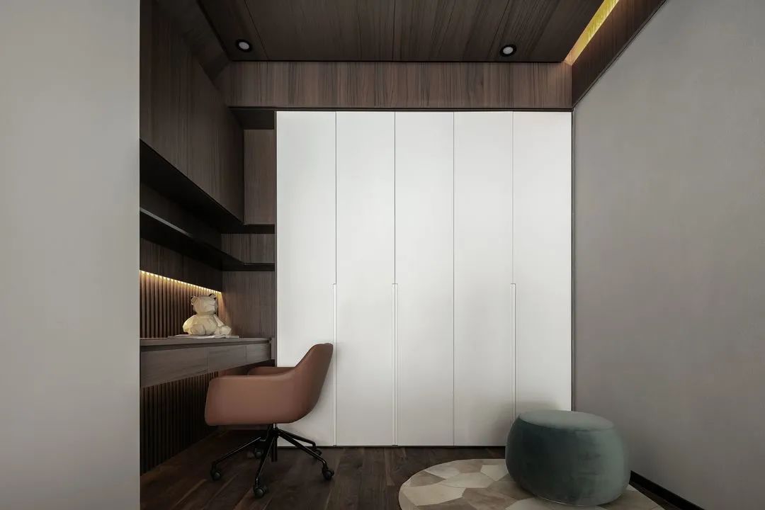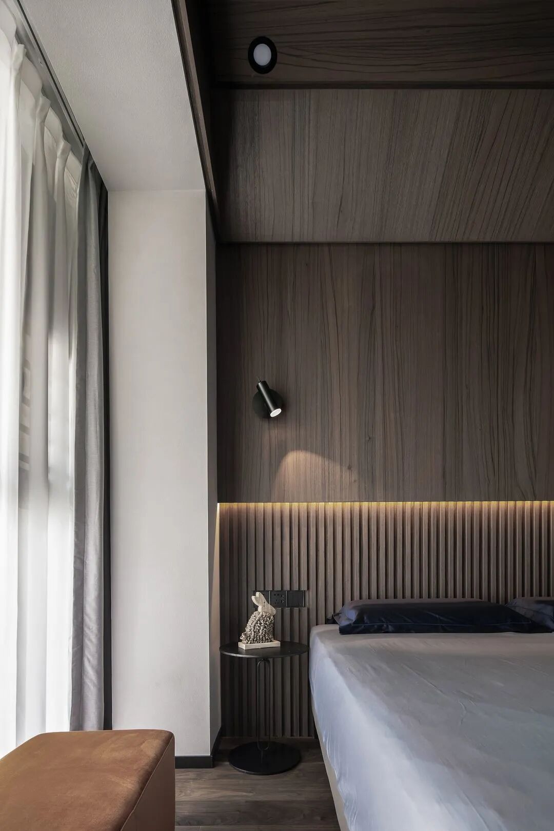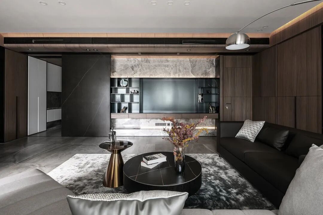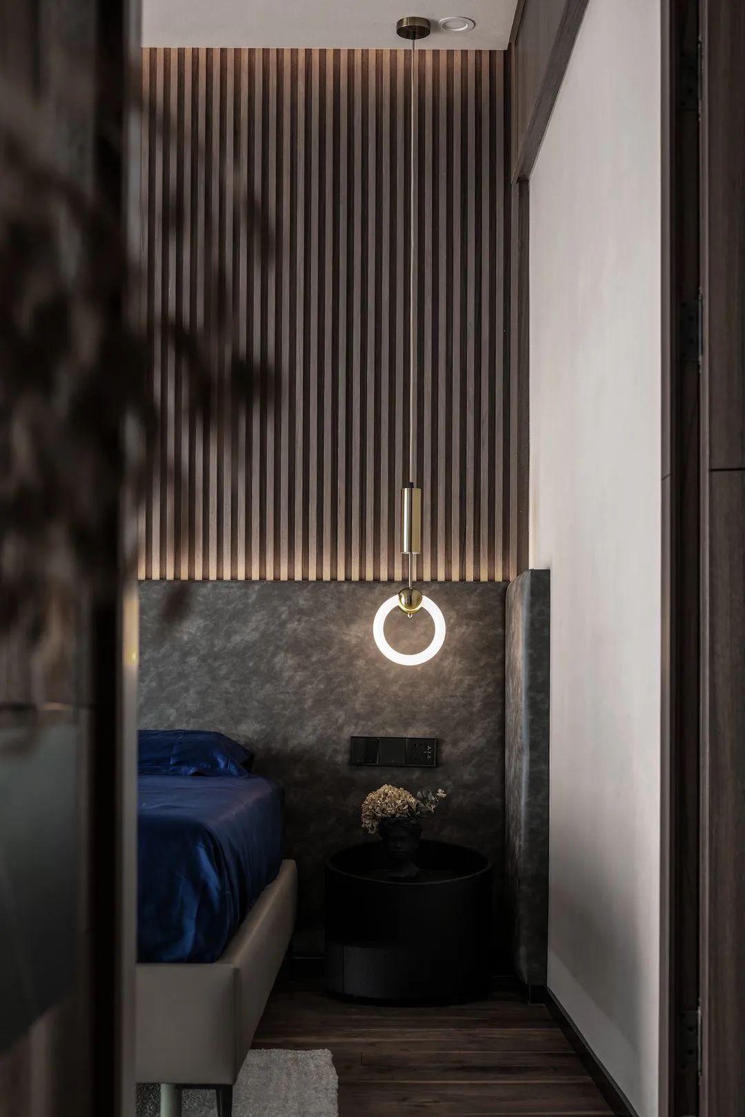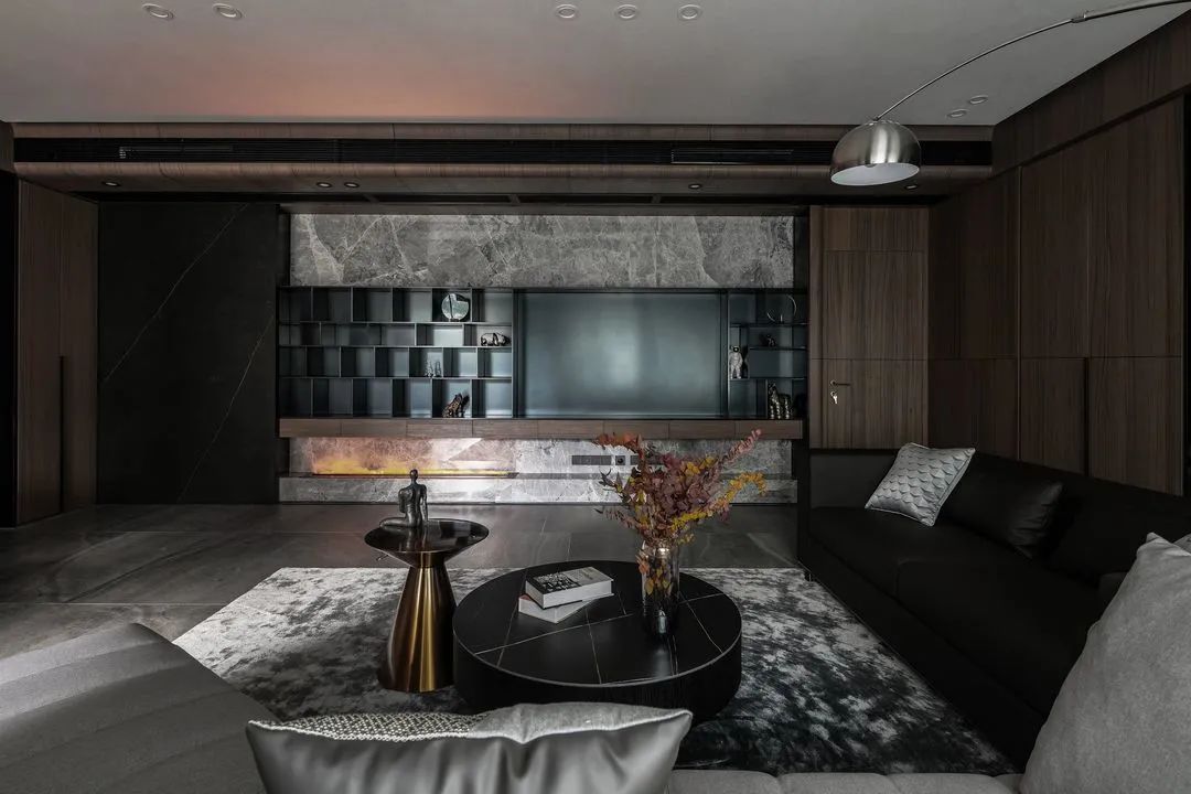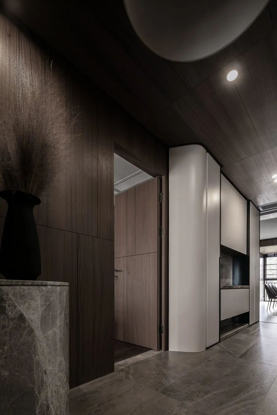 ......屋主对家设计要求高,希望通过设计师的巧思,获得舒适,细节丰富,有设计感以及高质感的空间体验。在设计师的调整下,将各个房间的重新布局,并且根据屋主需求在空间大小上进行分配。在功能分区不变的前提下,重新分配了每个区域的占用面积,整体以客餐厅为主,主卧中包括了衣帽间和书房的功能。两个次卧一间预备作为儿童房,另一间次卧做套间设计,作为双方老人居住的房间。家里对于储物需求大,在入户的左手边的过道两边设置了一整排储物柜,用以平时出入门的物品的放置。过道的尽头是次卧与儿童房,次卧的旁边有两个卫生间。主人家的鞋特别多,两排储物柜可以满足放置。一整排的顶天立地柜,中间一部分柜子下方悬空,底部大理石地台挑高,配合底部暗藏灯带,削弱空间压抑感又扩大了整体空间感。中空可放置杂物、饰品摆设。下方可以放置鞋子。白色烤漆柜门,柜子采用了无把手设计,中空部分采用了大理石台面,吊柜底部为木饰面,两侧用黑色不锈钢收口。木质与大理石的搭配,显得沉稳又有高级感。地面地砖是三分之一工字铺的工艺。电视背景墙为白底灰纹的大理石面,下方为250mm高的抬高,用于放置机顶盒和音响。电视下是木饰面的层板,两侧用黑色不锈钢收边,冷色与暖色的碰撞,以沉稳的黑色作为白色与木色之间的分界,既为效果做缓冲,也使空间更有整体性。电视背景墙设置了一个黑色不锈钢的错层层架,搭配个性的饰品,让这面墙有了生气和活力,同时打破了色彩单一的局面。地面采用的是三分之一工字铺的仿岩板地砖,黑色的双人沙发与黑色的电视背景墙相呼应。搭配两个白色抱枕,让空间色调有跳脱感。客厅以灰色的可活动三人沙发为主,黑色的圆形茶几,搭配金属面的落地灯和果盘摆件,让整个空间显得高级又耐看。搭配灰白色的地毯,空间的色彩一下子丰富起来了。在电视背景墙左边那一块为吊轨移门设计,材质为黑色岩板,重量达三百多斤。由我们的施工队的师傅现场安装。轨道从大门边起,到电视背景墙边黑色不锈钢为止。图为客厅灯光全开的样子,在白天,这个户型采光非常棒。客厅做了大平顶无主灯设计,四周留反光灯槽装灯带,吊顶为白色涂料,吊顶上装筒灯。图为移门关闭后的效果,作为动区与静区的隔断,黑色岩板更厚实、更隔音。如图上所见,电视背景墙下发光的部分是蒸汽壁炉,给整体沉稳的色调带来了一丝烟火气。沙发后面的一整排的柜子,玻璃的窄边黑框门和木饰面的层板相得益彰,展示着主人家的心爱之物,可以看出层板加厚,内嵌暗藏灯带。乐高迷都想要这样子的展示柜。餐厅采用了卡座+单椅的模式,以满足未来人口的增加,也可满足休息日时的小聚会。靠墙的是皮质的灰色卡座,十分舒适,皮质的餐椅,黄铜色的金属细脚,与客厅沙发边几呼应。显得更加有高级感。灰色的卡座,餐桌背景墙为木格栅造型,与餐桌台面的色彩形成了对比。卡座两侧放置这两盏方形壁灯,暖黄色的灯光与木色是绝佳搭配。墙面为黑色瓷砖,台面为大理石纹路的白色岩板,细脚铁艺高脚凳搭配白色岩板吧台,一切显得那么素净又优雅。台上放置一个黄铜色金属面的小花盆,一抹绿意让吧台区显得更加休闲、惬意。弧形的木饰面吊顶,区分客餐厅与阳台休闲区域,与餐厅的背景木饰面呼应,让吧台区域显得更加放松,业主与三两好友坐在窗台边,品着美酒,迎着丝丝缕缕的阳光,整个场景显得十分有仪式感。将客厅的小阳台打通,整面墙落地窗配合两边封闭的墙面,形成一个小空间,景色以及采光极好,作为吧台区再合适不过。无论是用餐还是与好友闲聊座谈,都能享受窗外的美景。保留大阳台作为景观阳台。吧台墙面上为现场制作的层板置物架,墙面为黑色瓷砖。从右边进入厨房的墙面用了黑色不锈钢做了过渡。厨房为封闭式厨房,采用了长虹玻璃门作为隔断,既美观又实用。将厨房与小阳台中间的墙体打掉,将阳台融入厨房里,整个空间的利用率提高了许多,光线也十分好。厨房采用了u字形的布局,整体智能化家电。大家电均为嵌入式电器,考虑到业主爱热炒,采用的是封闭式厨房的形式。墙面为哑光石材,橱柜柜门都是灰色岩板,台面为白色岩板,地面为防岩板地砖。单厨房电器便花费三十多万。在这6平米的厨房的功能性与颜值并存。床头背景墙整面为木格栅,搭配棕色的床头硬包,上方暗藏灯带。吊灯刷白,周围一圈暗藏灯带。床头两侧搭配了小巧精致的圆环形状的吊灯。整体效果优雅,让人身心放松。落地的玻璃窗搭配日夜帘,透入的阳光柔和又浪漫,温润了空间的温度,也提升了舒适度。床头吊灯可以把床头柜的空间释放出来,圆环形状的吊灯散发着暖暖的黄色灯光,使得主卧有了温度的感觉,从而与客厅的简约高冷的格调区分开。简单的圆环造型吊灯又让整屋的风格有了联系。灰色的圆形床头柜更加柔和,避免磕碰。灰色也与整体风格相呼应,也在视觉效果上显得低调、沉稳。地面为木地板,与墙上的木格栅呼应。一切显得自然、纯粹。在主卧做了套房设计,将书房、衣帽间合二为一,保留在主卧空间内。以电视背景墙作为分隔,主卧的电视背景墙为柜体式的背景墙,白色烤漆柜门,搭配黑色钢板,下空的位置用大理石纹路的白色岩板做了一个抬高处理。整体显得简洁利落。很舒适的一个角落,主卧里的书房衣帽间区域的落地窗,搭配一