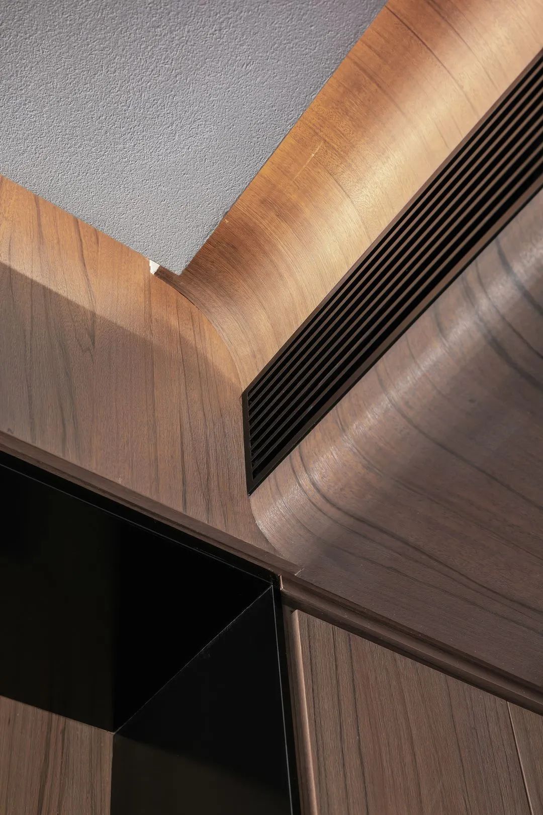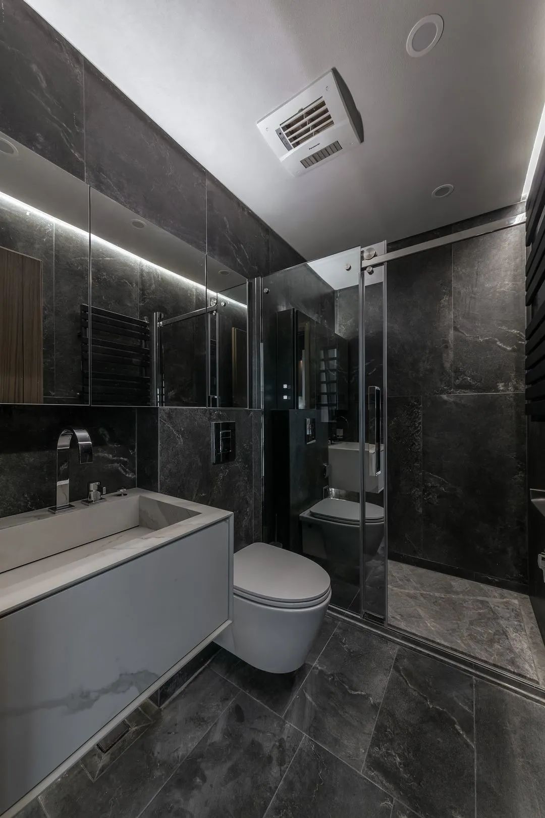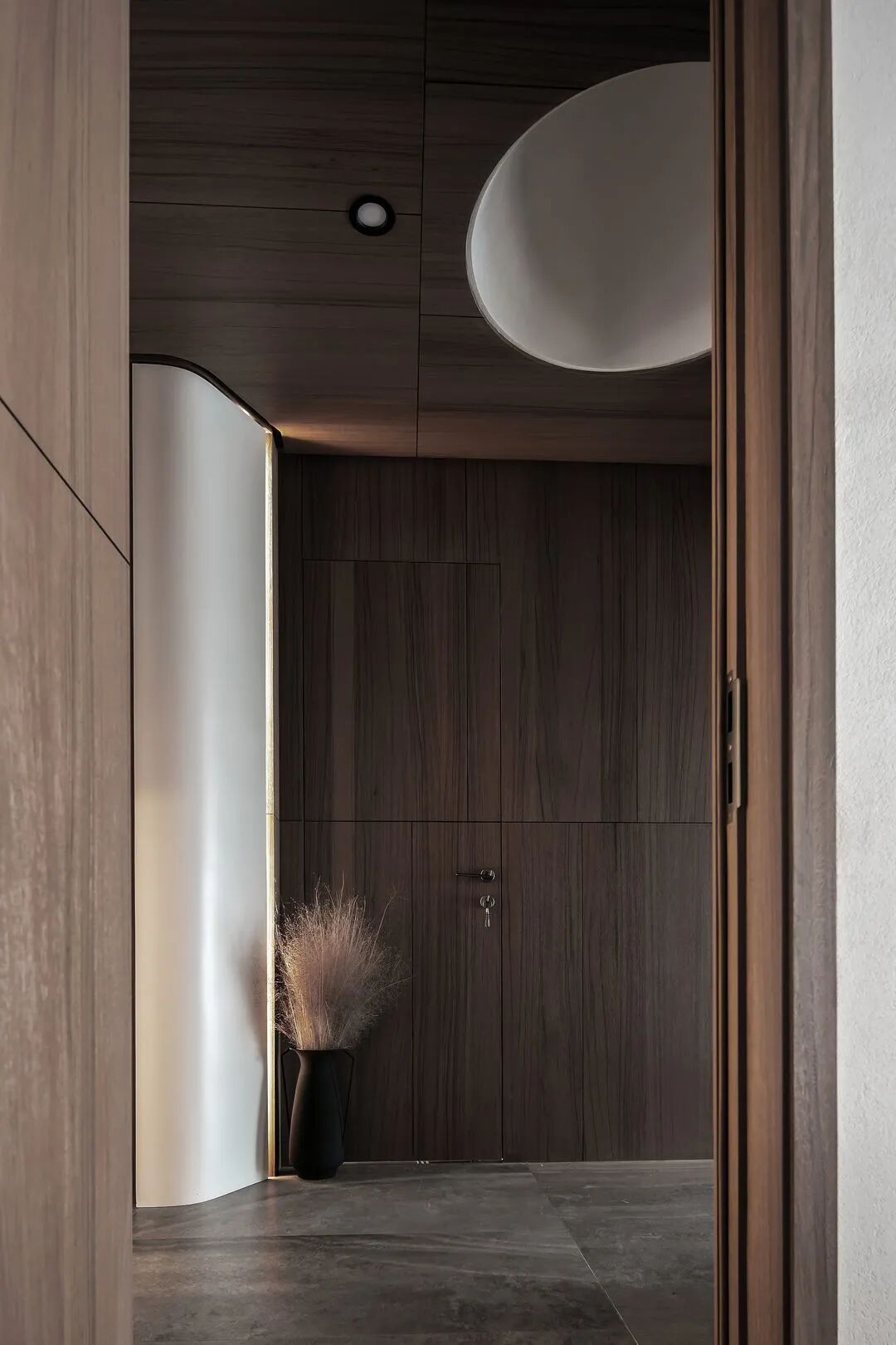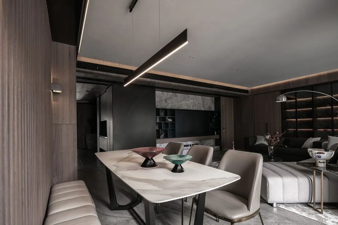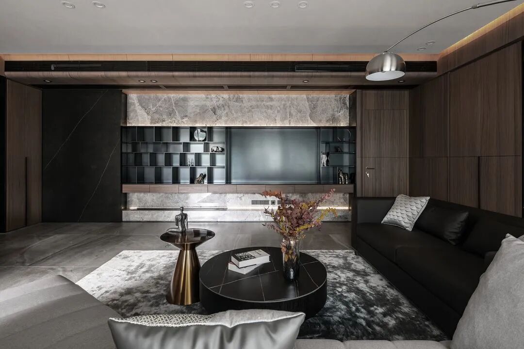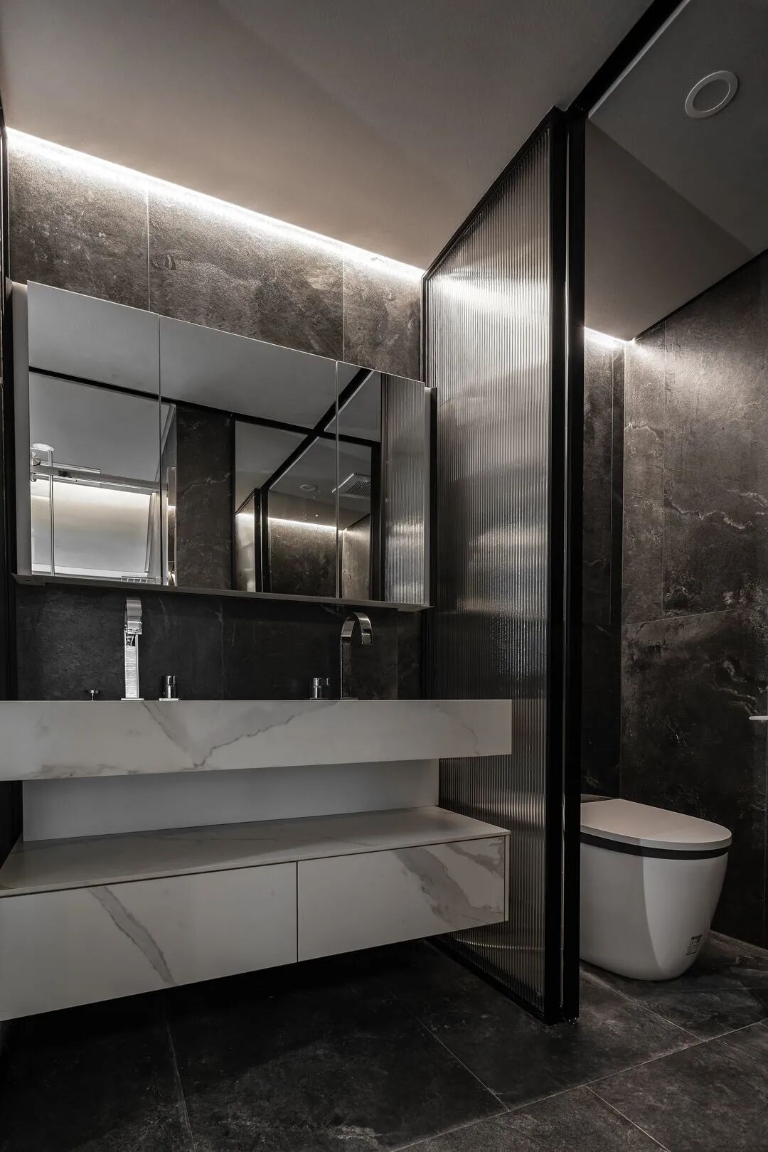 ......屋主对家设计要求高,希望通过设计师的巧思,获得舒适,细节丰富,有设计感以及高质感的空间体验。在设计师的调整下,将各个房间的重新布局,并且根据屋主需求在空间大小上进行分配。在功能分区不变的前提下,重新分配了每个区域的占用面积,整体以客餐厅为主,主卧中包括了衣帽间和书房的功能。两个次卧一间预备作为儿童房,另一间次卧做套间设计,作为双方老人居住的房间。家里对于储物需求大,在入户的左手边的过道两边设置了一整排储物柜,用以平时出入门的物品的放置。过道的尽头是次卧与儿童房,次卧的旁边有两个卫生间。主人家的鞋特别多,两排储物柜可以满足放置。一整排的顶天立地柜,中间一部分柜子下方悬空,底部大理石地台挑高,配合底部暗藏灯带,削弱空间压抑感又扩大了整体空间感。中空可放置杂物、饰品摆设。下方可以放置鞋子。白色烤漆柜门,柜子采用了无把手设计,中空部分采用了大理石台面,吊柜底部为木饰面,两侧用黑色不锈钢收口。木质与大理石的搭配,显得沉稳又有高级感。地面地砖是三分之一工字铺的工艺。电视背景墙为白底灰纹的大理石面,下方为250mm高的抬高,用于放置机顶盒和音响。电视下是木饰面的层板,两侧用黑色不锈钢收边,冷色与暖色的碰撞,以沉稳的黑色作为白色与木色之间的分界,既为效果做缓冲,也使空间更有整体性。电视背景墙设置了一个黑色不锈钢的错层层架,搭配个性的饰品,让这面墙有了生气和活力,同时打破了色彩单一的局面。地面采用的是三分之一工字铺的仿岩板地砖,黑色的双人沙发与黑色的电视背景墙相呼应。搭配两个白色抱枕,让空间色调有跳脱感。客厅以灰色的可活动三人沙发为主,黑色的圆形茶几,搭配金属面的落地灯和果盘摆件,让整个空间显得高级又耐看。搭配灰白色的地毯,空间的色彩一下子丰富起来了。在电视背景墙左边那一块为吊轨移门设计,材质为黑色岩板,重量达三百多斤。由我们的施工队的师傅现场安装。轨道从大门边起,到电视背景墙边黑色不锈钢为止。图为客厅灯光全开的样子,在白天,这个户型采光非常棒。客厅做了大平顶无主灯设计,四周留反光灯槽装灯带,吊顶为白色涂料,吊顶上装筒灯。图为移门关闭后的效果,作为动区与静区的隔断,黑色岩板更厚实、更隔音。如图上所见,电视背景墙下发光的部分是蒸汽壁炉,给整体沉稳的色调带来了一丝烟火气。沙发后面的一整排的柜子,玻璃的窄边黑框门和木饰面的层板相得益彰,展示着主人家的心爱之物,可以看出层板加厚,内嵌暗藏灯带。乐高迷都想要这样子的展示柜。餐厅采用了卡座+单椅的模式,以满足未来人口的增加,也可满足休息日时的小聚会。靠墙的是皮质的灰色卡座,十分舒适,皮质的餐椅,黄铜色的金属细脚,与客厅沙发边几呼应。显得更加有高级感。灰色的卡座,餐桌背景墙为木格栅造型,与餐桌台面的色彩形成了对比。卡座两侧放置这两盏方形壁灯,暖黄色的灯光与木色是绝佳搭配。墙面为黑色瓷砖,台面为大理石纹路的白色岩板,细脚铁艺高脚凳搭配白色岩板吧台,一切显得那么素净又优雅。台上放置一个黄铜色金属面的小花盆,一抹绿意让吧台区显得更加休闲、惬意。弧形的木饰面吊顶,区分客餐厅与阳台休闲区域,与餐厅的背景木饰面呼应,让吧台区域显得更加放松,业主与三两好友坐在窗台边,品着美酒,迎着丝丝缕缕的阳光,整个场景显得十分有仪式感。将客厅的小阳台打通,整面墙落地窗配合两边封闭的墙面,形成一个小空间,景色以及采光极好,作为吧台区再合适不过。无论是用餐还是与好友闲聊座谈,都能享受窗外的美景。保留大阳台作为景观阳台。吧台墙面上为现场制作的层板置物架,墙面为黑色瓷砖。从右边进入厨房的墙面用了黑色不锈钢做了过渡。厨房为封闭式厨房,采用了长虹玻璃门作为隔断,既美观又实用。将厨房与小阳台中间的墙体打掉,将阳台融入厨房里,整个空间的利用率提高了许多,光线也十分好。厨房采用了u字形的布局,整体智能化家电。大家电均为嵌入式电器,考虑到业主爱热炒,采用的是封闭式厨房的形式。墙面为哑光石材,橱柜柜门都是灰色岩板,台面为白色岩板,地面为防岩板地砖。单厨房电器便花费三十多万。在这6平米的厨房的功能性与颜值并存。床头背景墙整面为木格栅,搭配棕色的床头硬包,上方暗藏灯带。吊灯刷白,周围一圈暗藏灯带。床头两侧搭配了小巧精致的圆环形状的吊灯。整体效果优雅,让人身心放松。落地的玻璃窗搭配日夜帘,透入的阳光柔和又浪漫,温润了空间的温度,也提升了舒适度。床头吊灯可以把床头柜的空间释放出来,圆环形状的吊灯散发着暖暖的黄色灯光,使得主卧有了温度的感觉,从而与客厅的简约高冷的格调区分开。简单的圆环造型吊灯又让整屋的风格有了联系。灰色的圆形床头柜更加柔和,避免磕碰。灰色也与整体风格相呼应,也在视觉效果上显得低调、沉稳。地面为木地板,与墙上的木格栅呼应。一切显得自然、纯粹。在主卧做了套房设计,将书房、衣帽间合二为一,保留在主卧空间内。以电视背景墙作为分隔,主卧的电视背景墙为柜体式的背景墙,白色烤漆柜门,搭配黑色钢板,下空的位置用大理石纹路的白色岩板做了一个抬高处理。整体显得简洁利落。很舒适的一个角落,主卧里的书房衣帽间区域的落地窗,搭配一