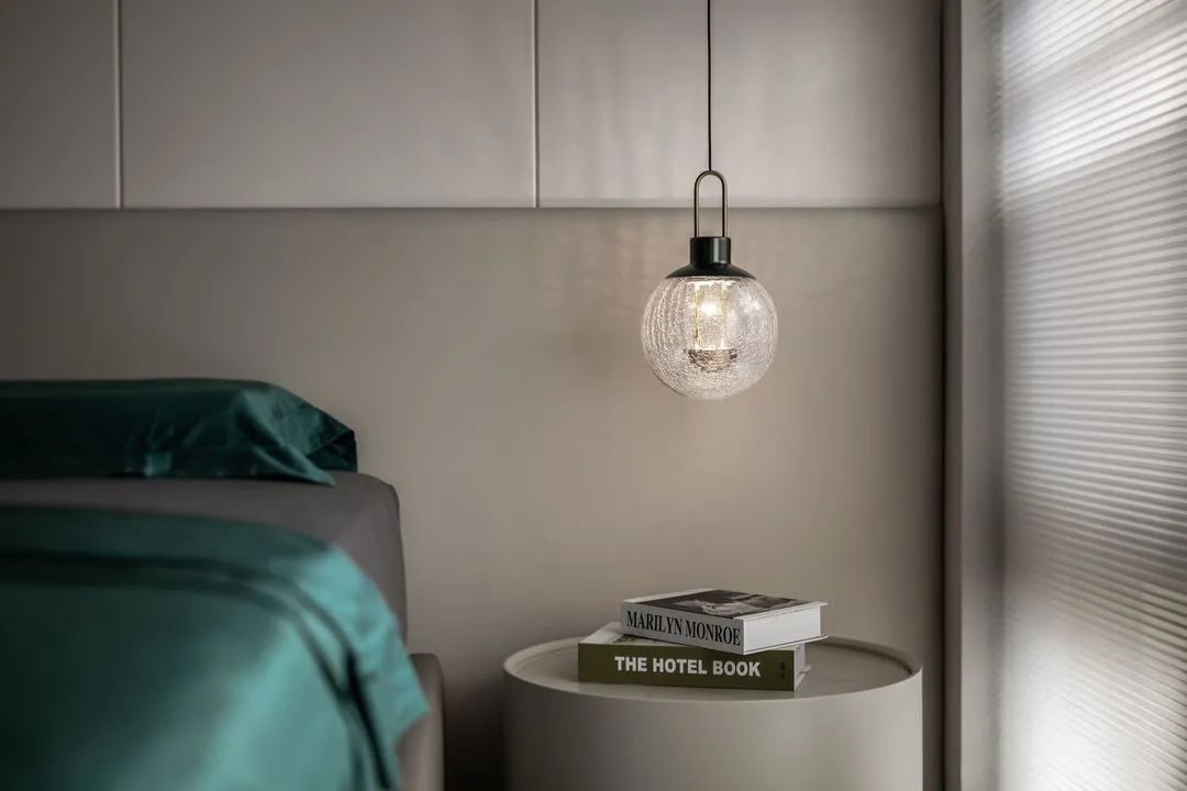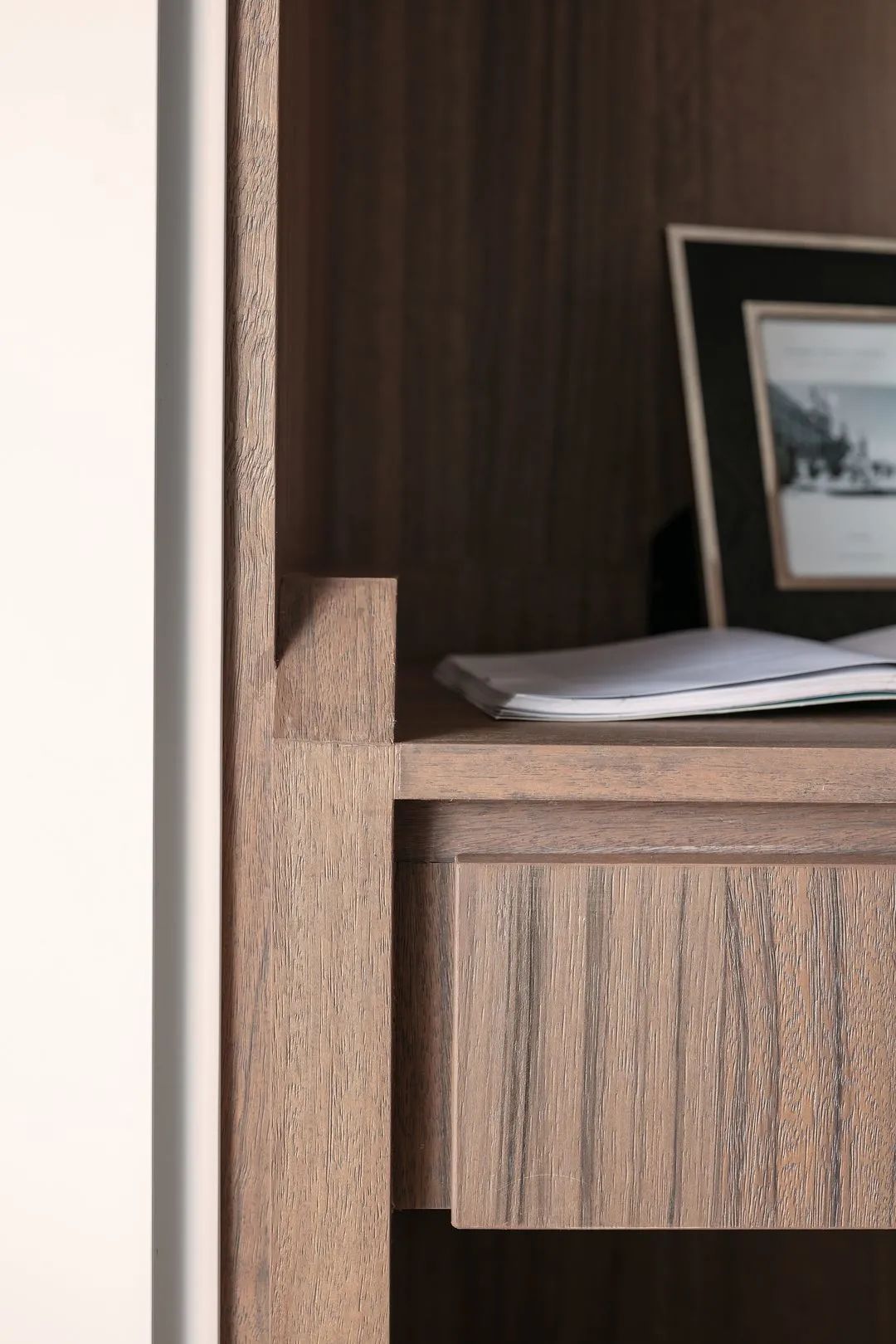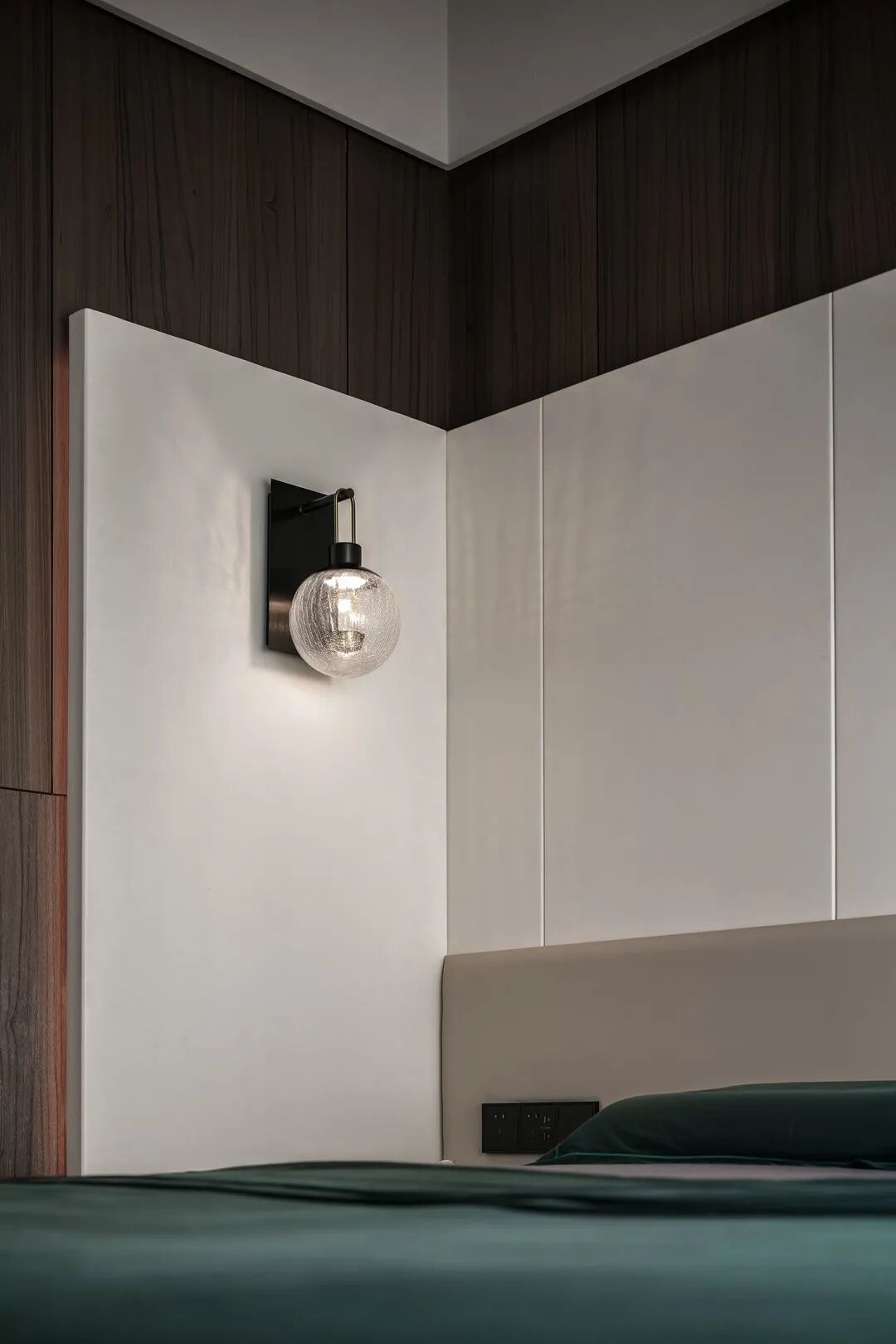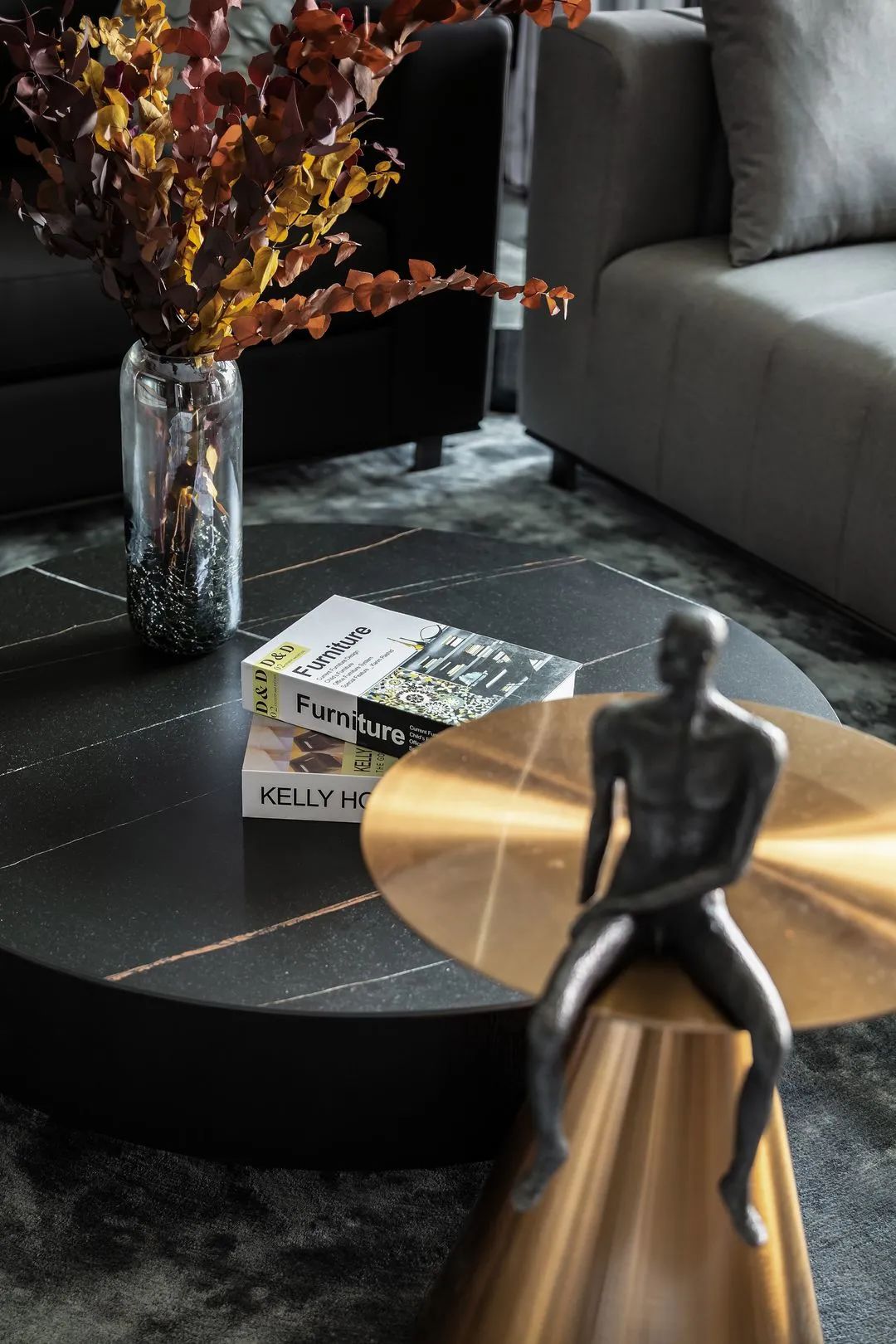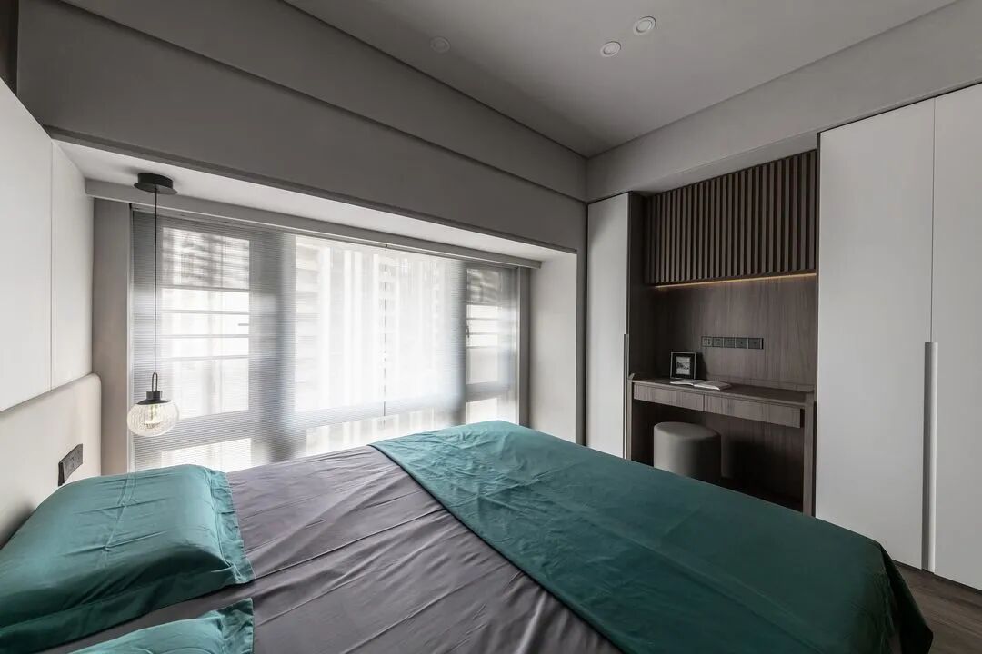 ......屋主对家设计要求高,希望通过设计师的巧思,获得舒适,细节丰富,有设计感以及高质感的空间体验。在设计师的调整下,将各个房间的重新布局,并且根据屋主需求在空间大小上进行分配。在功能分区不变的前提下,重新分配了每个区域的占用面积,整体以客餐厅为主,主卧中包括了衣帽间和书房的功能。两个次卧一间预备作为儿童房,另一间次卧做套间设计,作为双方老人居住的房间。家里对于储物需求大,在入户的左手边的过道两边设置了一整排储物柜,用以平时出入门的物品的放置。过道的尽头是次卧与儿童房,次卧的旁边有两个卫生间。主人家的鞋特别多,两排储物柜可以满足放置。一整排的顶天立地柜,中间一部分柜子下方悬空,底部大理石地台挑高,配合底部暗藏灯带,削弱空间压抑感又扩大了整体空间感。中空可放置杂物、饰品摆设。下方可以放置鞋子。白色烤漆柜门,柜子采用了无把手设计,中空部分采用了大理石台面,吊柜底部为木饰面,两侧用黑色不锈钢收口。木质与大理石的搭配,显得沉稳又有高级感。地面地砖是三分之一工字铺的工艺。电视背景墙为白底灰纹的大理石面,下方为250mm高的抬高,用于放置机顶盒和音响。电视下是木饰面的层板,两侧用黑色不锈钢收边,冷色与暖色的碰撞,以沉稳的黑色作为白色与木色之间的分界,既为效果做缓冲,也使空间更有整体性。电视背景墙设置了一个黑色不锈钢的错层层架,搭配个性的饰品,让这面墙有了生气和活力,同时打破了色彩单一的局面。地面采用的是三分之一工字铺的仿岩板地砖,黑色的双人沙发与黑色的电视背景墙相呼应。搭配两个白色抱枕,让空间色调有跳脱感。客厅以灰色的可活动三人沙发为主,黑色的圆形茶几,搭配金属面的落地灯和果盘摆件,让整个空间显得高级又耐看。搭配灰白色的地毯,空间的色彩一下子丰富起来了。在电视背景墙左边那一块为吊轨移门设计,材质为黑色岩板,重量达三百多斤。由我们的施工队的师傅现场安装。轨道从大门边起,到电视背景墙边黑色不锈钢为止。图为客厅灯光全开的样子,在白天,这个户型采光非常棒。客厅做了大平顶无主灯设计,四周留反光灯槽装灯带,吊顶为白色涂料,吊顶上装筒灯。图为移门关闭后的效果,作为动区与静区的隔断,黑色岩板更厚实、更隔音。如图上所见,电视背景墙下发光的部分是蒸汽壁炉,给整体沉稳的色调带来了一丝烟火气。沙发后面的一整排的柜子,玻璃的窄边黑框门和木饰面的层板相得益彰,展示着主人家的心爱之物,可以看出层板加厚,内嵌暗藏灯带。乐高迷都想要这样子的展示柜。餐厅采用了卡座+单椅的模式,以满足未来人口的增加,也可满足休息日时的小聚会。靠墙的是皮质的灰色卡座,十分舒适,皮质的餐椅,黄铜色的金属细脚,与客厅沙发边几呼应。显得更加有高级感。灰色的卡座,餐桌背景墙为木格栅造型,与餐桌台面的色彩形成了对比。卡座两侧放置这两盏方形壁灯,暖黄色的灯光与木色是绝佳搭配。墙面为黑色瓷砖,台面为大理石纹路的白色岩板,细脚铁艺高脚凳搭配白色岩板吧台,一切显得那么素净又优雅。台上放置一个黄铜色金属面的小花盆,一抹绿意让吧台区显得更加休闲、惬意。弧形的木饰面吊顶,区分客餐厅与阳台休闲区域,与餐厅的背景木饰面呼应,让吧台区域显得更加放松,业主与三两好友坐在窗台边,品着美酒,迎着丝丝缕缕的阳光,整个场景显得十分有仪式感。将客厅的小阳台打通,整面墙落地窗配合两边封闭的墙面,形成一个小空间,景色以及采光极好,作为吧台区再合适不过。无论是用餐还是与好友闲聊座谈,都能享受窗外的美景。保留大阳台作为景观阳台。吧台墙面上为现场制作的层板置物架,墙面为黑色瓷砖。从右边进入厨房的墙面用了黑色不锈钢做了过渡。厨房为封闭式厨房,采用了长虹玻璃门作为隔断,既美观又实用。将厨房与小阳台中间的墙体打掉,将阳台融入厨房里,整个空间的利用率提高了许多,光线也十分好。厨房采用了u字形的布局,整体智能化家电。大家电均为嵌入式电器,考虑到业主爱热炒,采用的是封闭式厨房的形式。墙面为哑光石材,橱柜柜门都是灰色岩板,台面为白色岩板,地面为防岩板地砖。单厨房电器便花费三十多万。在这6平米的厨房的功能性与颜值并存。床头背景墙整面为木格栅,搭配棕色的床头硬包,上方暗藏灯带。吊灯刷白,周围一圈暗藏灯带。床头两侧搭配了小巧精致的圆环形状的吊灯。整体效果优雅,让人身心放松。落地的玻璃窗搭配日夜帘,透入的阳光柔和又浪漫,温润了空间的温度,也提升了舒适度。床头吊灯可以把床头柜的空间释放出来,圆环形状的吊灯散发着暖暖的黄色灯光,使得主卧有了温度的感觉,从而与客厅的简约高冷的格调区分开。简单的圆环造型吊灯又让整屋的风格有了联系。灰色的圆形床头柜更加柔和,避免磕碰。灰色也与整体风格相呼应,也在视觉效果上显得低调、沉稳。地面为木地板,与墙上的木格栅呼应。一切显得自然、纯粹。在主卧做了套房设计,将书房、衣帽间合二为一,保留在主卧空间内。以电视背景墙作为分隔,主卧的电视背景墙为柜体式的背景墙,白色烤漆柜门,搭配黑色钢板,下空的位置用大理石纹路的白色岩板做了一个抬高处理。整体显得简洁利落。很舒适的一个角落,主卧里的书房衣帽间区域的落地窗,搭配一