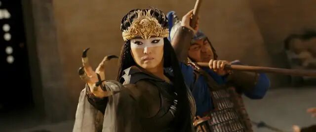 巩俐演了一个类似黑女巫的角色,戴着一个不知道有什么意义的冠,半张脸刷了白泥面膜,既可以变成一群黑乌鸦,又可以变成一只雕,杀伤力很大。