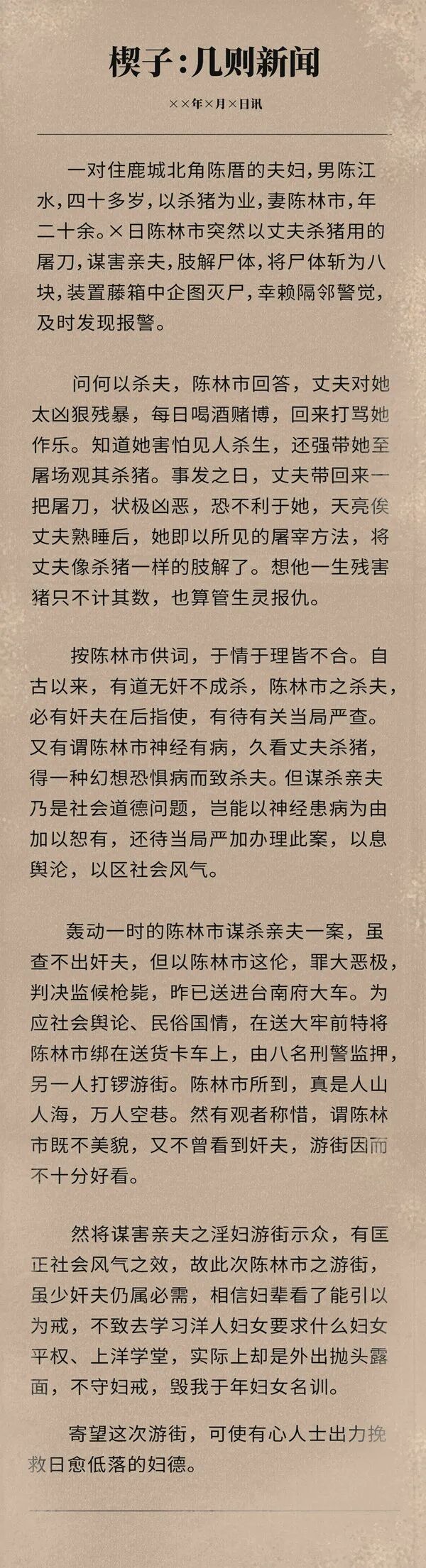 比如,根据案发当年的《申报》和庭审记录记载,死者并不是屠夫,而是卖旧货的,他给写成了屠夫,顺道把凶器从菜刀换成杀猪刀,他还虚构了女人的口供,“地上血渍也是我冲干净的,我在杀猪场,常常帮他这样洗刷血渍。”