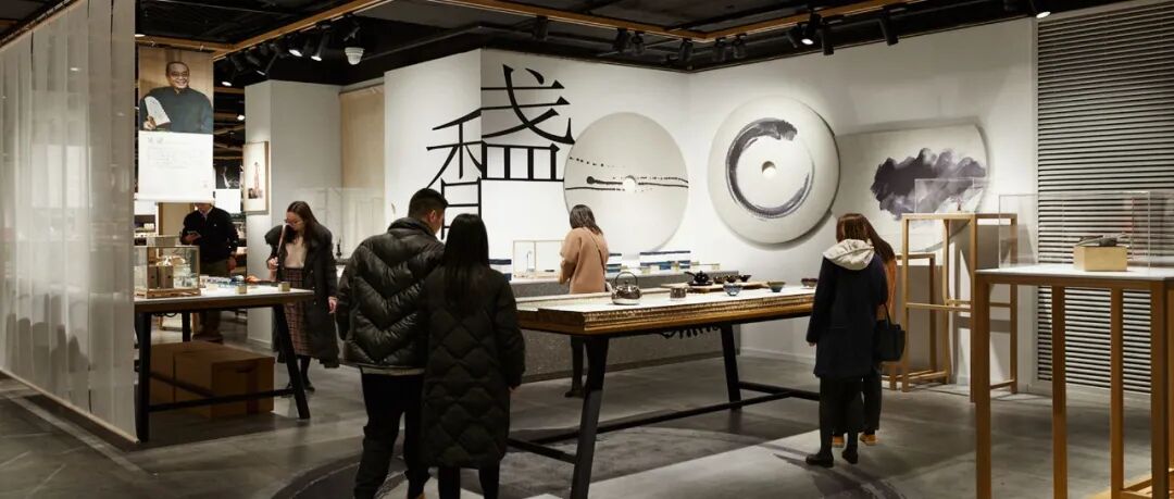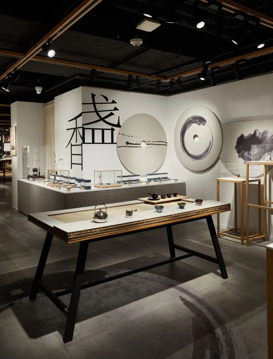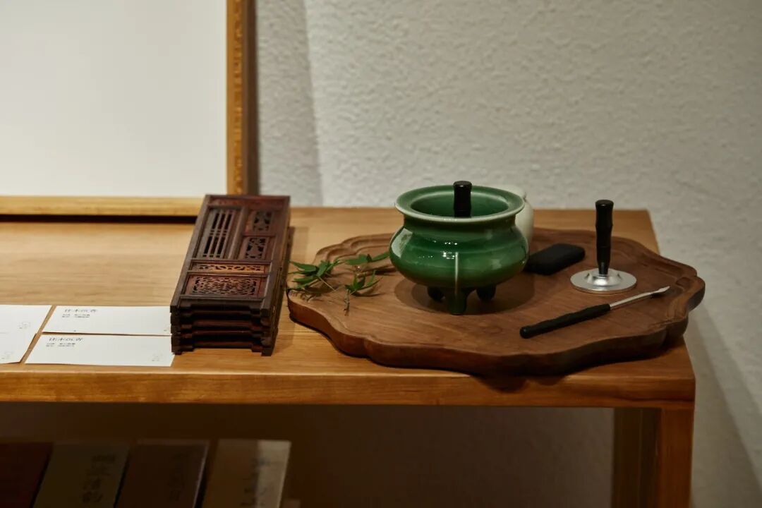 整个空间三分之一的区域,布置了一场美学展览,15位匠人的香、茶、器三个类目的作品,以及2位青年艺术家的画作,分别错落分布在不同的展台。