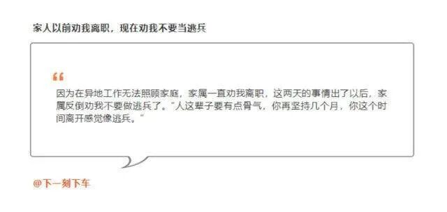 其中有一个昵称为@下一刻下车 的网友说:因为在异地工作无法照顾家庭,家属一直劝我离职,这两天的事情出了以后,家属反倒劝我不要做逃兵了。“人这辈子要有点骨气,你再坚持几个月,你这个时间离开感觉像逃兵。”