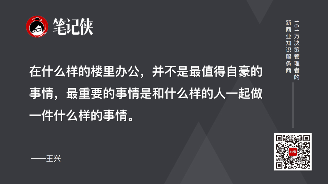 王兴曾说,在什么样的楼里办公,并不是最值得自豪的事情,最重要的事情是和什么样的人一起做一件什么样的事情。