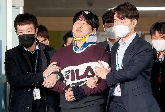 当地时间2020年3月25日,韩国首尔,韩国“N号房”头目赵主彬(中)离开警察局,将被移交检方作进一步调查。(图片来源:视觉中国)