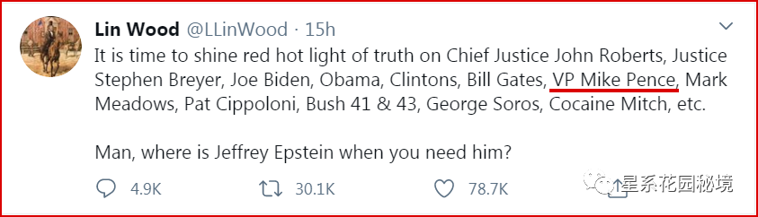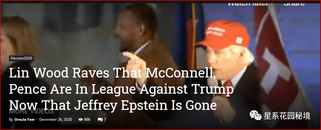2020年12月26日,川建国的私人律师林伍德在推特上开喷那些与爱泼斯坦性奴岛事件有关联的“华盛顿沼泽罪犯”…民主党人和公开的RINO都在其列,然而,令人震惊的却是:副总统彭斯也在名单之中…