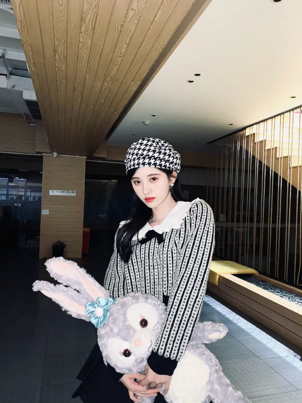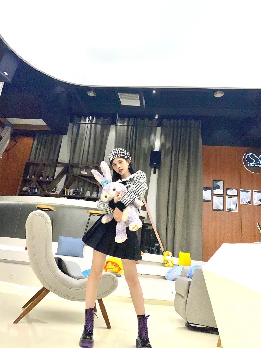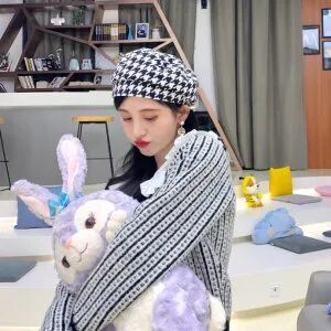 千鸟格贝雷帽搭配同色系上衣,再搭配一只萌萌的星黛露,鞠婧祎这身穿搭复古中透着一丝可爱~上短下长的基础搭配,一定程度上又提高了腰线比例,完美避免了小个子女生的身材BUG。