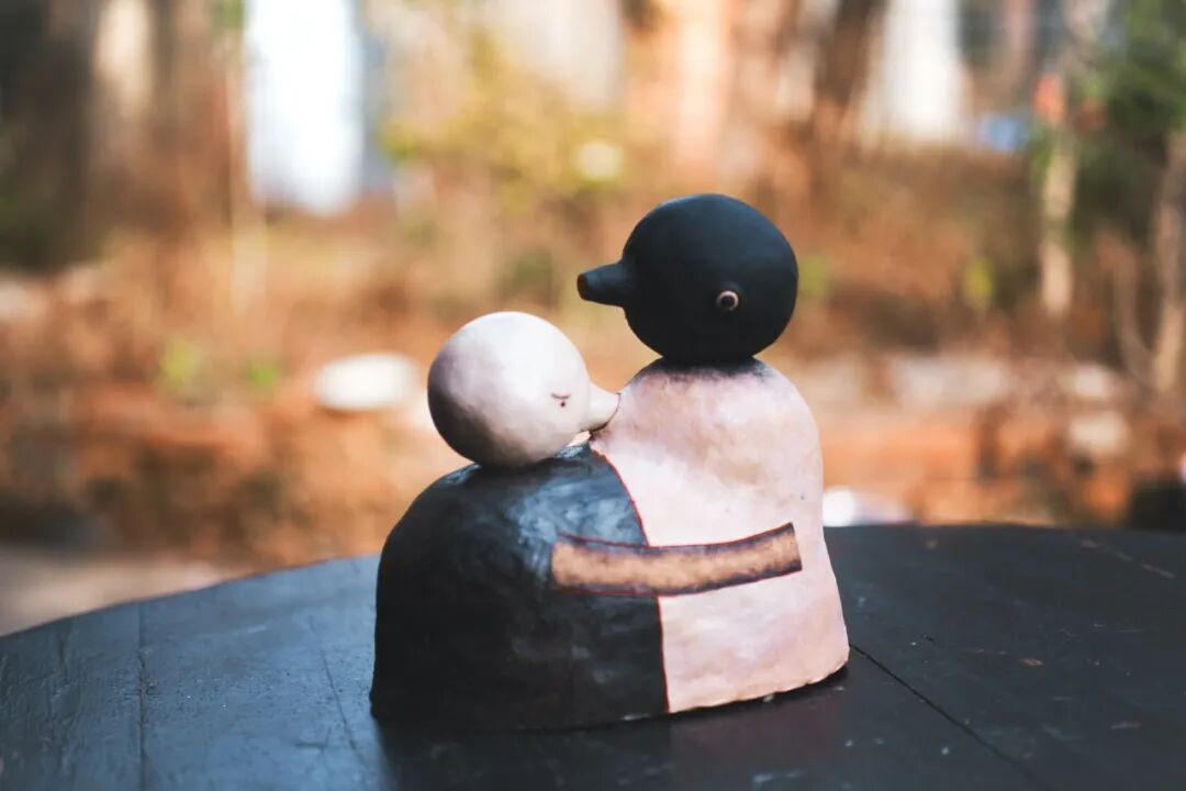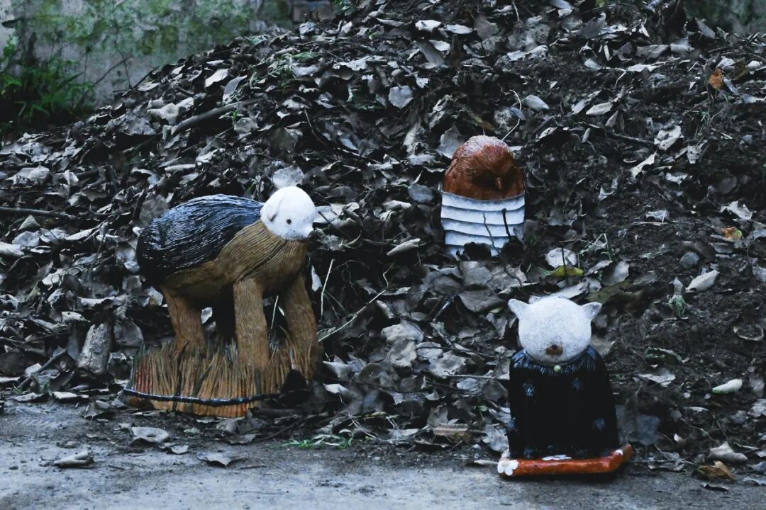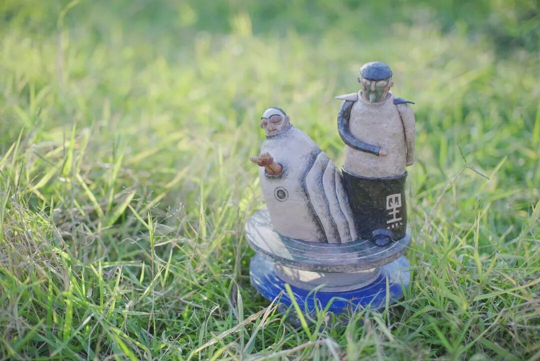 两人的家上下两层,空间不大,但通透明亮。从一侧窗户往下看是著名的陶艺街,鳞桎相连的店铺和工作坊在洪水后逐渐恢复生机。露台上的三个立柜,摆着各式泥塑小人和杯盘器皿,都是他们从7月洪水中“抢救”出来的旧作;另一个立柜已装满王啸新做的姿态各异、幽默怪诞的动物雕塑,这批作品已经被腾挪至南京的画廊展出。