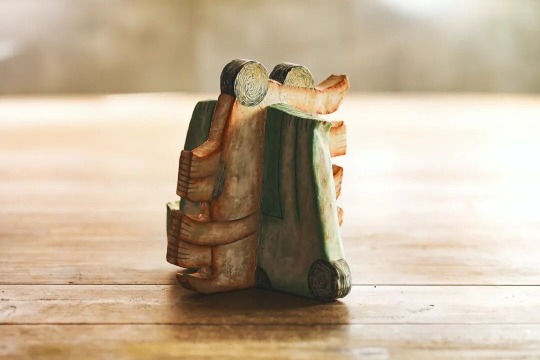 王啸的创作方法以盘泥条为主,不论做什么,先随意地盘一个形,再做各种肌理或变形。高温烧制之后,再在釉上彩绘。做一件长宽约30厘米的作品,周期至少要20多天。早期他做了很多奇奇怪怪的人形雕塑,把它们统一归纳为“小人”。这些小人雕塑就像隐藏着神秘力量,自由生长出各种造型,色彩斑斓,细节丰富。“许多动物形象的雕塑,不是说我看到一只鸟或一条虫,就把它的模样做出来,”王啸说,他把自己的想象、对生活的感受和情绪,全部融进作品里。