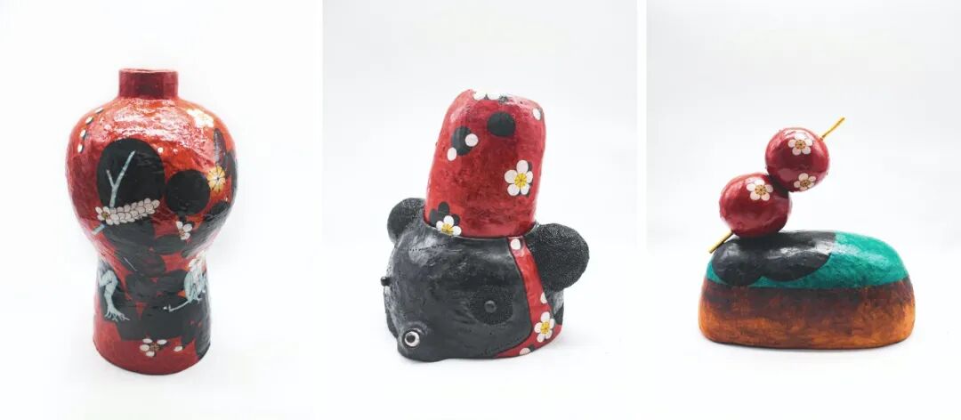 王啸的雕塑中,常出现“红地白梅”的元素,这是景德镇很传统的图案。这件花瓶也是景德镇的一个传统器型“梅瓶”。在景德镇做陶瓷,对工艺的要求非常高,烧制白色瓶子时容易出现黑点,这是被避讳的瑕疵。而王啸却故意把黑点放大,“让它凸起来,皮里面长了一个包的感觉。”更夸张时他把包做成一个怪物,还长了一只眼睛。最后整个瓶身就变成黑乎乎的,黑暗中藏着很多图案。