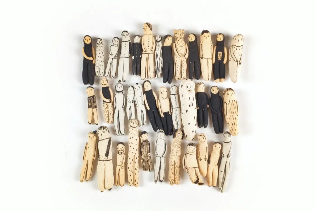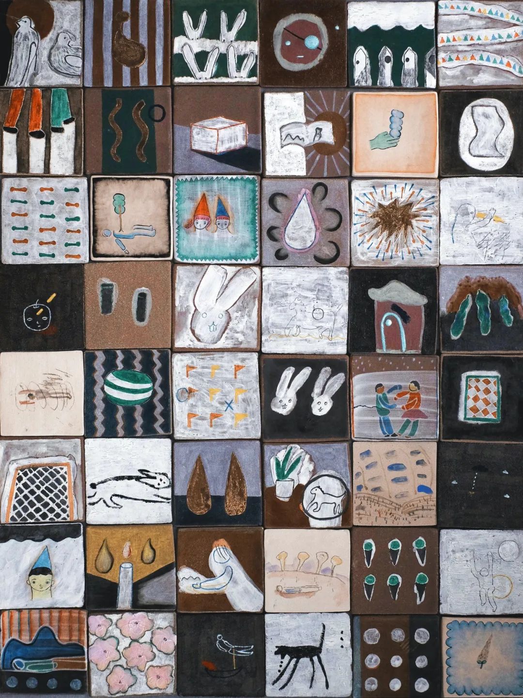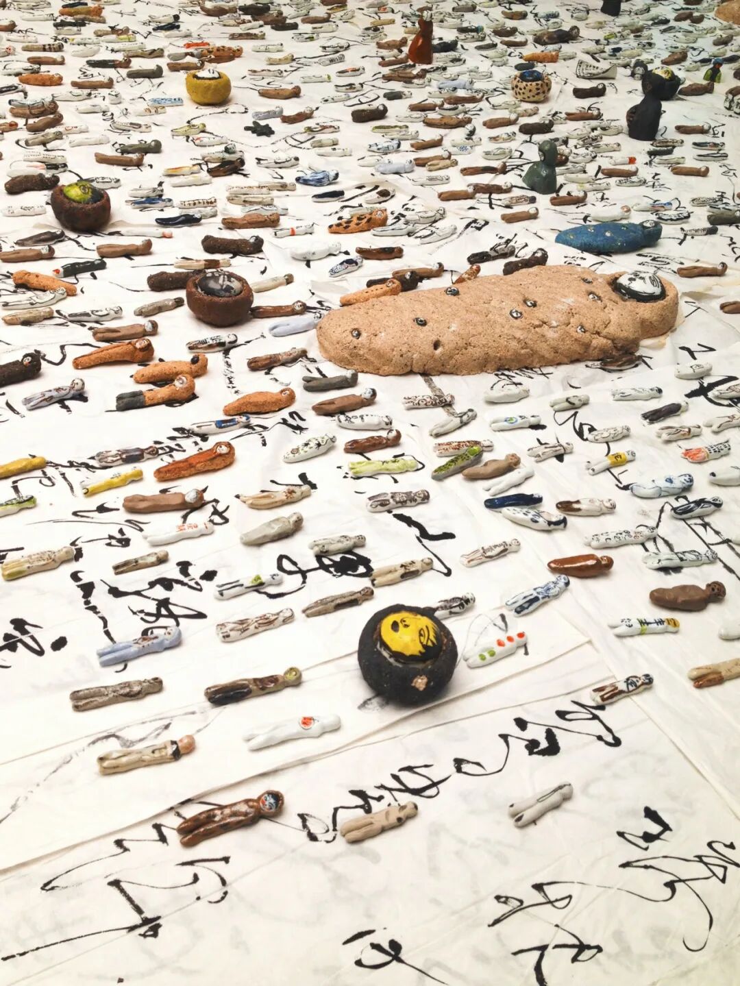 2013年研究生毕业创作时,晓雪单独来了一趟景德镇,40多天做了1000多件小人。最后呈现时,她让小人们一个个地躺在地上,铺在写有毛笔字的宣纸上。“在纸本或者架上绘画,想加一笔、想覆盖、想改都可以立马动笔,非常新鲜,也非常冲动。”晓雪跟我们解释,“瓷板画和别的材料最大的区别就是,你必须得等。”想要一种颜色,需先烧制、再冷却,可能一两天就过去了。烧制了之后,刻出线条,再在线条里面填色。这个过程中,很多小的技法就往里面添加,她说乐趣点也正是在这。