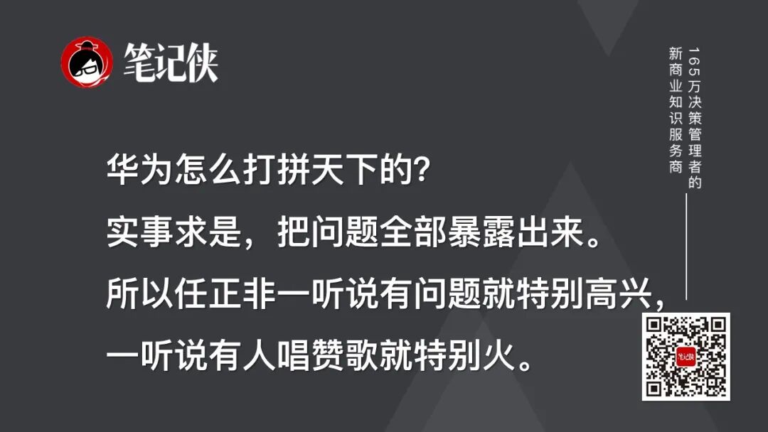 这个叫什么?闻过则喜。华为怎么打拼天下的?实事求是,把问题全部暴露出来。所以任正非一听说有问题就特别高兴,一听说有人唱赞歌就特别火。